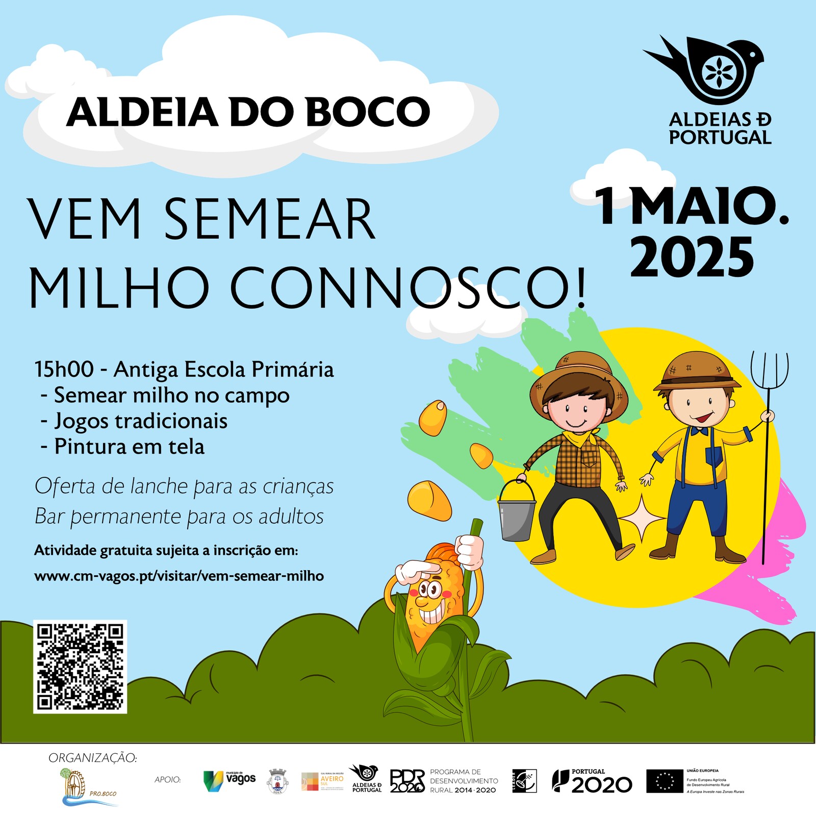 Neste dia, 1 de maio, a partir das 15h00, no Boco – Aldeia de Portugal, as crianças terão a oportunidade de semear milho num campo agrícola próximo da sede da Associação (antiga escola primária do Boco) sendo que para além desta atividade, haverá, também, jogos tradicionais, e pintura em tela! No final, será oferecido um lanche às crianças!