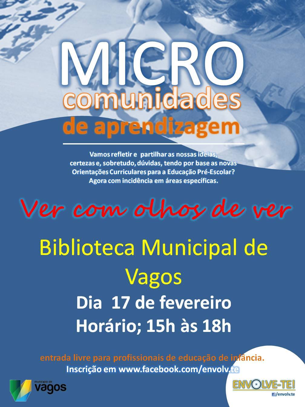 A Biblioteca Municipal de Vagos recebe, no dia 17 de fevereiro de 2018, das 15h00 às 18h00, mais um encontro do projeto das Micro Comunidades de aprendizagem desta vez com o tema “Ver com olhos de ver”, da organização Envolve-te.
