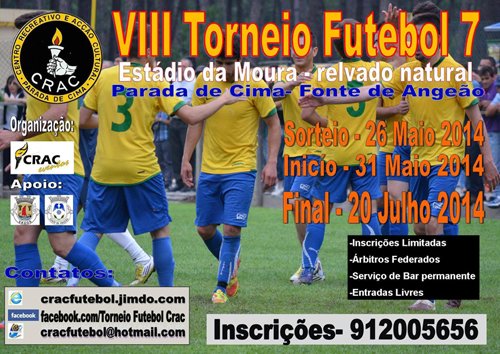 Dará início amanhã, dia 31 de maio, no Estádio da Moura, na Parada de Cima, em Fonte de Angeão, o VIII Torneio de Futebol 7 do Centro Recreativo e Ação Cultural (CRAC).