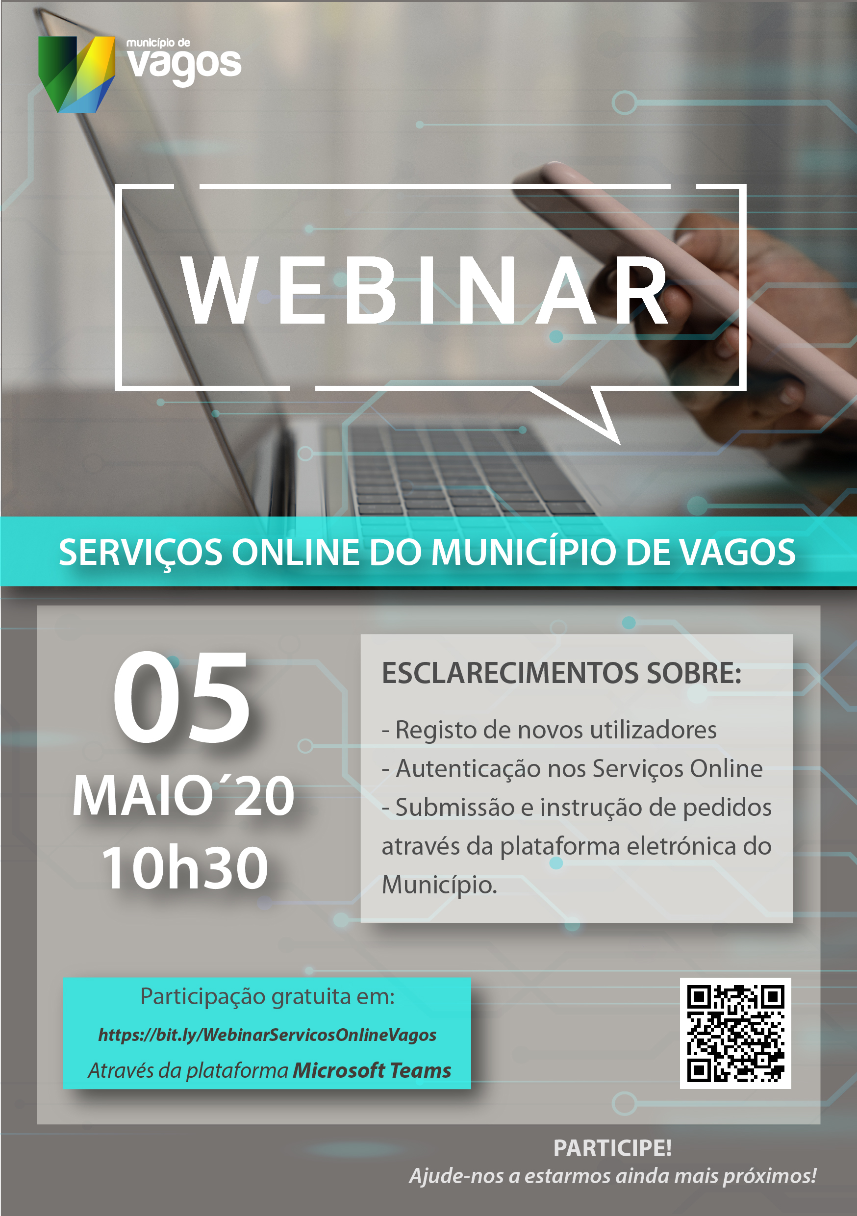 O Município de Vagos irá realizar no próximo dia 5 de maio, pelas 10h30, um Webinar através da plataforma Microsoft Teams acerca dos Serviços Online .