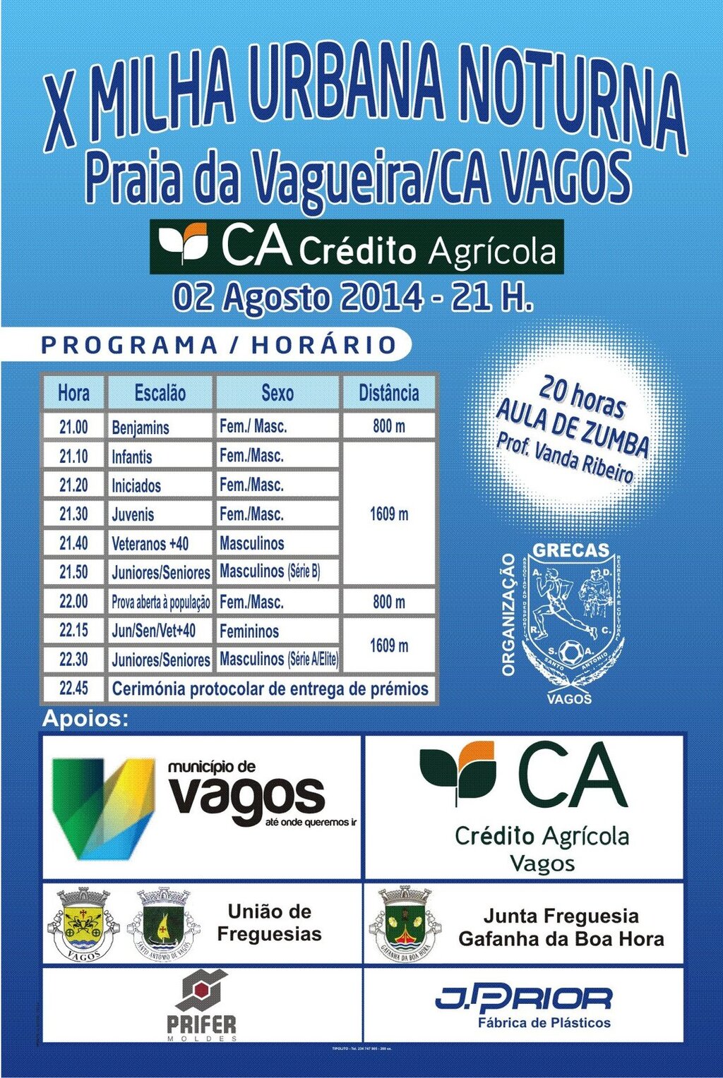 O GRECAS – Vagos em parceria com a Câmara Municipal de Vagos e o Crédito Agrícola de Vagos, leva a efeito, no dia 2 de agosto de 2014,pelas 21h, a X Milha Urbana Noturna Praia da Vagueira/CA Vagos, no Largo Parracho Branco, na Praia da Vagueira. Este evento inclui provas para todos os escalões, desde benjamins a veteranos.