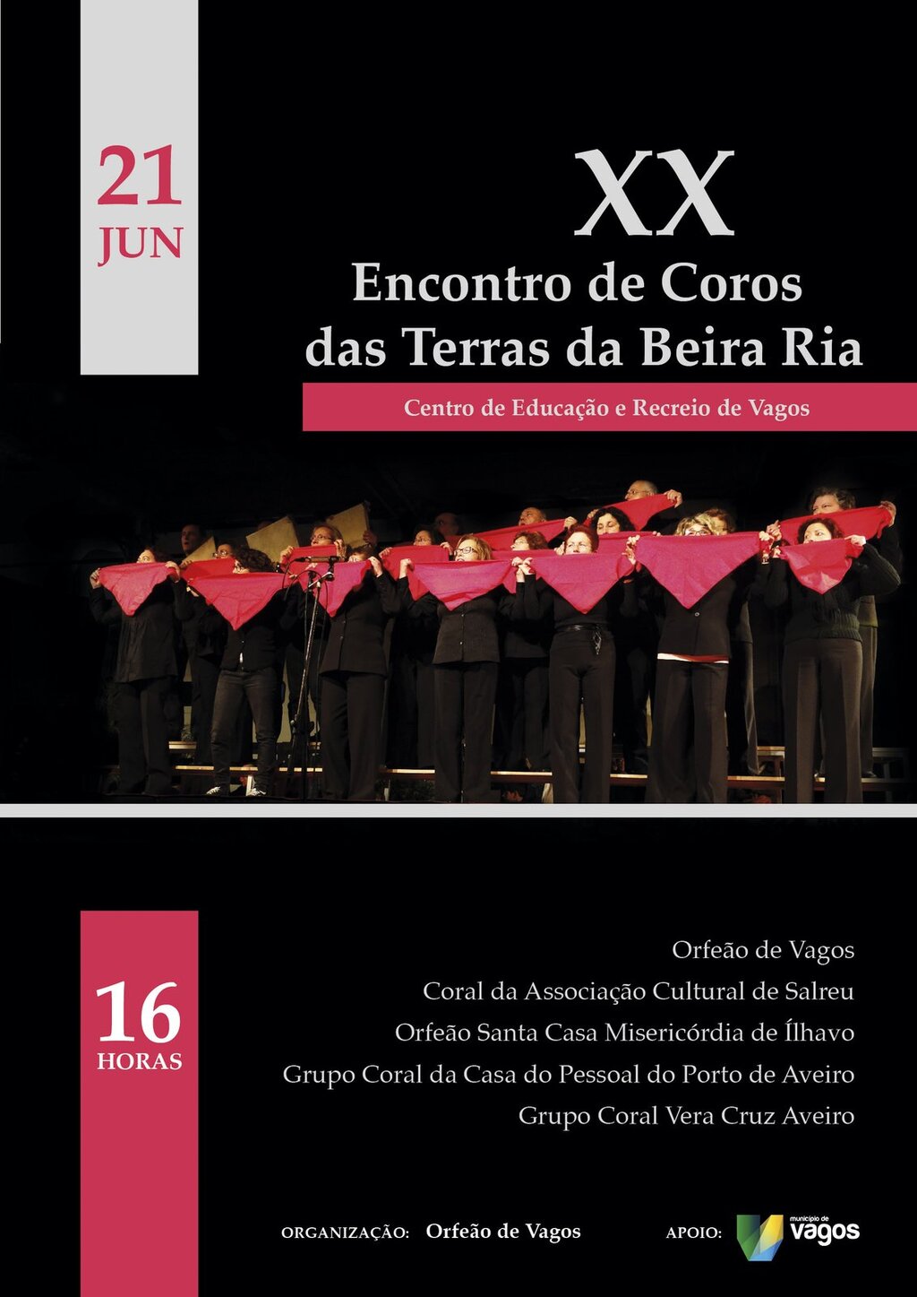 Realiza-se, no próximo dia 21 de junho, pelas 16h, o XX Encontro de Coros das Terras da Beira Ria, no Centro de Educação e Recreio de Vagos que conta com a participação dos seguintes coros: