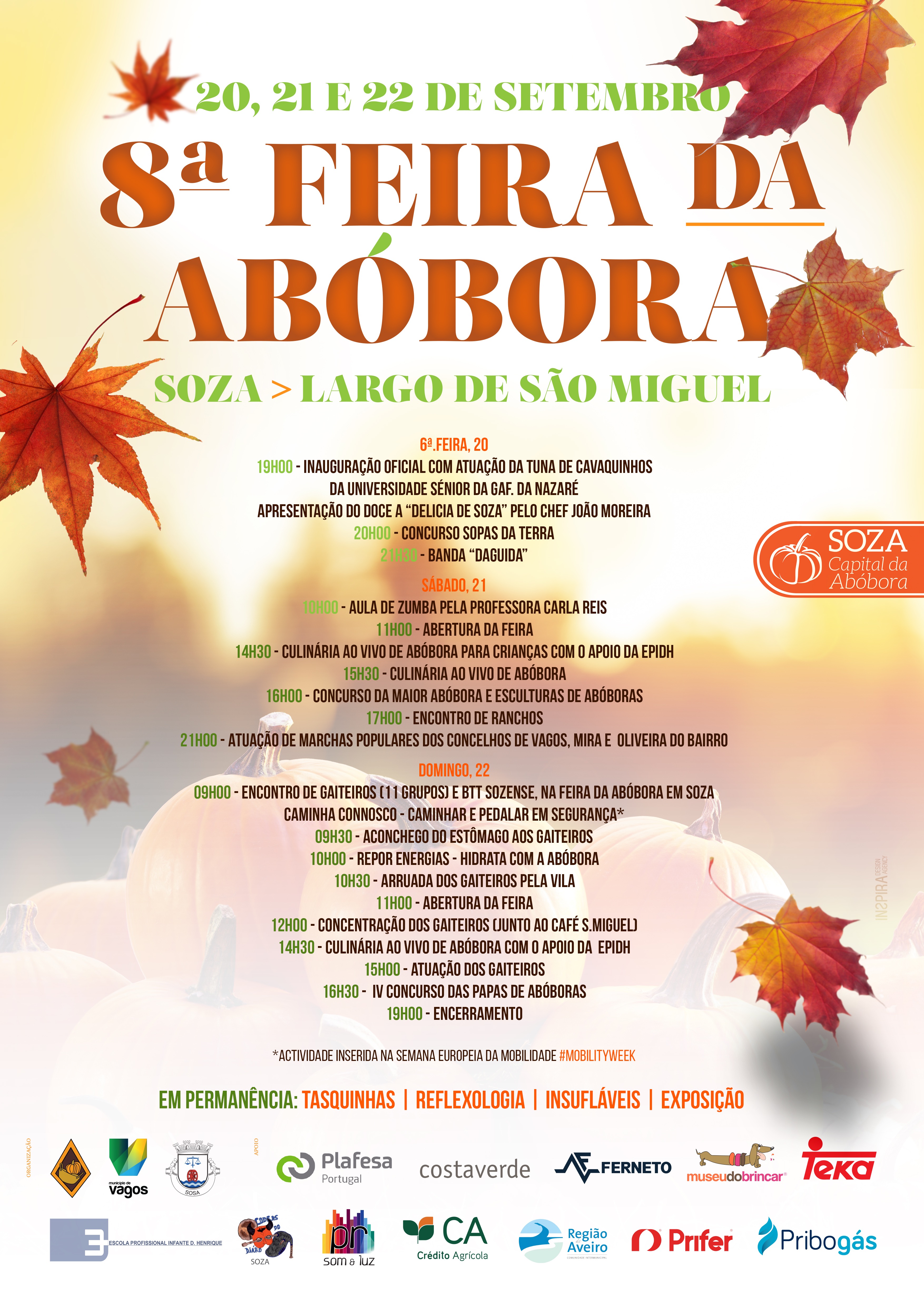 Neste certame estão previstas várias atividades, das quais destacamos a apresen-tação do doce a “Delícia de Soza”, pelo chefe João Moreira, o concurso “Sopas da Terra”, culinária ao vivo de abóbora para crianças, com o apoio da Escola Profis-sional Infante D. Henrique, concurso da maior abóbora e ainda os concursos de escultura e papas de abóbora. Nesta feira não irão faltar tasquinhas, insufláveis, sessões de reflexologia, exposições e mostras de vários produtos regionais, espe-táculos musicais e muita animação.