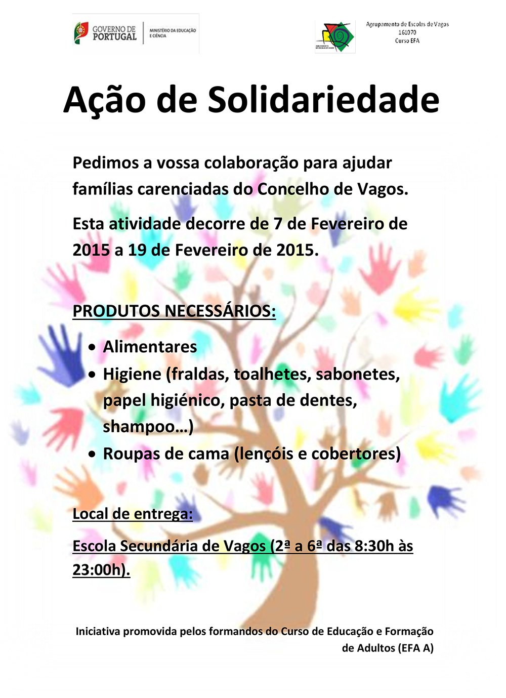 Decorre até dia 19 de fevereiro de 2015, na Escola Secundária de Vagos, a recolha de produtos e bens alimentares com o objetivo de ajudar as famílias carenciadas do concelho de Vagos. Esta iniciativa é promovida pelos formandos do curso de Educação e Formação de Adultos (EFA A).
