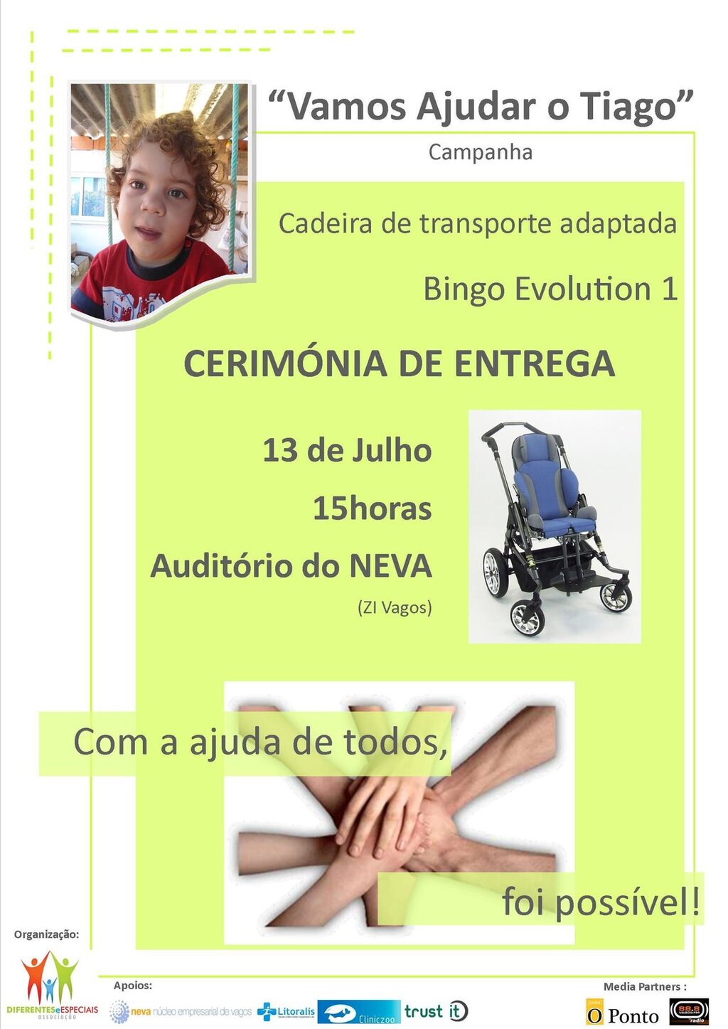 A Associação Diferentes e Especiais (ADE) composta por pais, familiares e amigos de crianças e jovens com deficiência e/ou doença crónica, sediada em Vagos, está a organizar a cerimónia de entrega do equipamento adaptado: Bingo Evolution 1, ao Tiago Lopes Tavares, criança de 2 anos e meio com paralisia cerebral espástica, encerrando assim a campanha intitulada “Vamos Ajudar o Tiago”. Este evento terá lugar no dia 13 de julho, às 15h00, no Auditório do NEVA na zona industrial de Vagos.