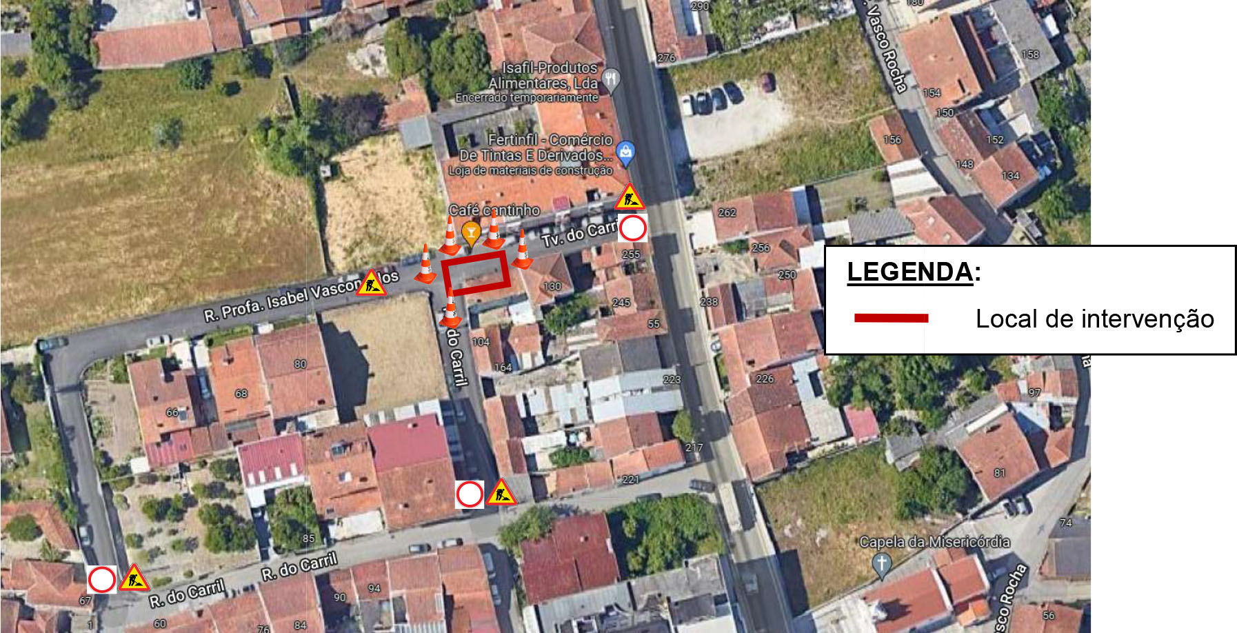 Corte total da faixa de rodagem, com indicação de trânsito proibido junto ao entroncamento com a Estrada Nacional 109 (N109); junto ao entroncamento com a Rua do Carril; e com o entroncamento com a Rua Profa. Isabel Vasconcelos, assegurando-se a delimitação da área de intervenção com cones de sinalização, conforme documento em baixo.
