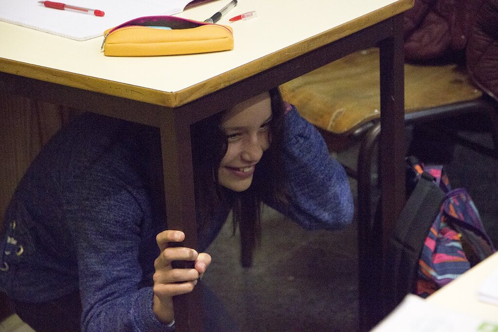 - PROTEGER: proteja a cabeça e o pescoço com os braços e as mãos e procure abrigar-se, coloque-se se possível debaixo da secretária ou uma mesa resistente, e segure-se a ela firmemente;