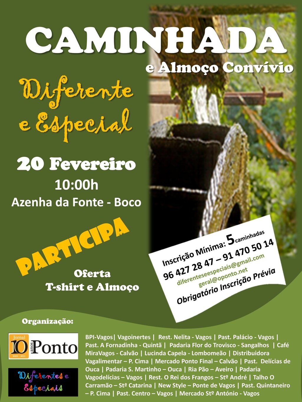 Realiza-se, no próximo domingo, 20 de Fevereiro de 2011, uma caminhada e almoço convívio, organizada pela Associação Diferentes e Especiais e o Jornal “O Ponto”. Esta acção procura aliar a prática desportiva, o contacto com a natureza e o espírito solidário. Tem ainda, como objectivos, a criação de condições, estruturas e meios para facilitar a integração plena das crianças com deficiências ou doença crónica numa sociedade livre de preconceito.