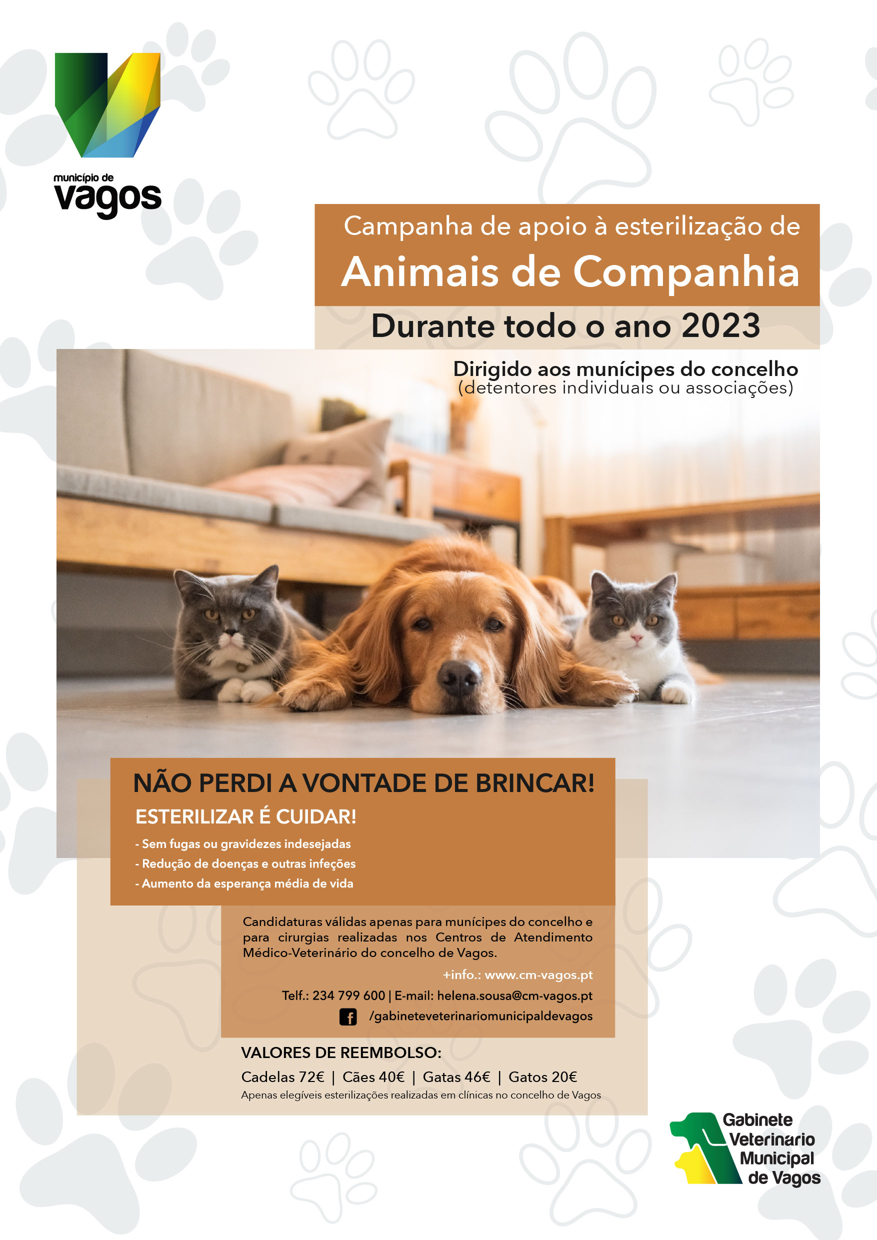 No seguimento das Campanhas de apoio à esterilização de animais de companhia lançadas nos últimos anos, a Câmara Municipal de Vagos decidiu prolongar o apoio à esterilização de animais de companhia (cães e gatos) dirigido aos munícipes do concelho (detentores individuais ou associações), lançando a atual Campanha que vigorará durante todo o ano de 2023, simplificando também o procedimento de candidatura.