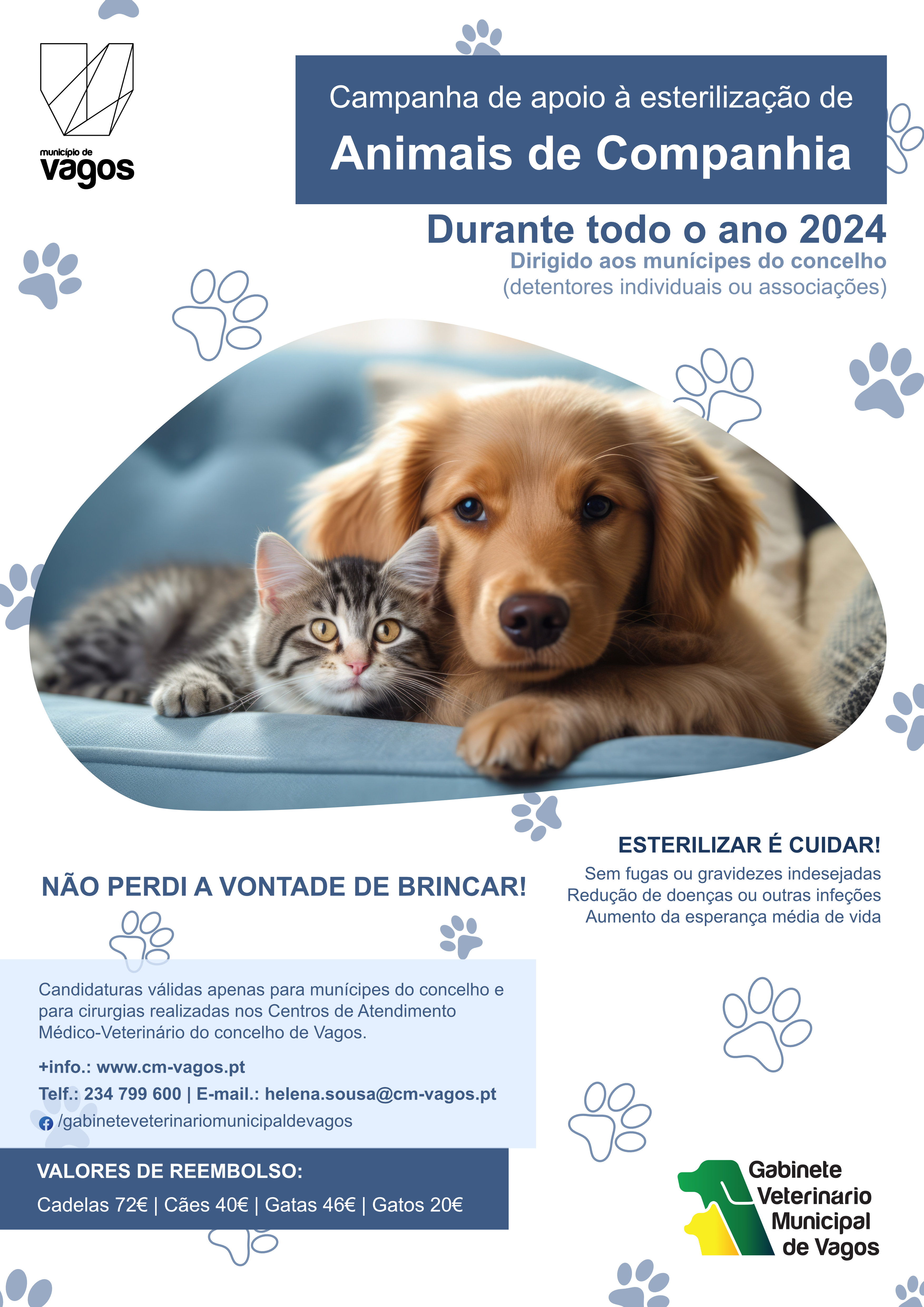A Câmara Municipal de Vagos aprovou o Programa Extraordinário de Apoio à Esterilização de Animais de Companhia, nomeadamente cães e gatos, dirigido aos munícipes do concelho, sejam detentores individuais ou associações, a ter lugar durante o ano de 2024.