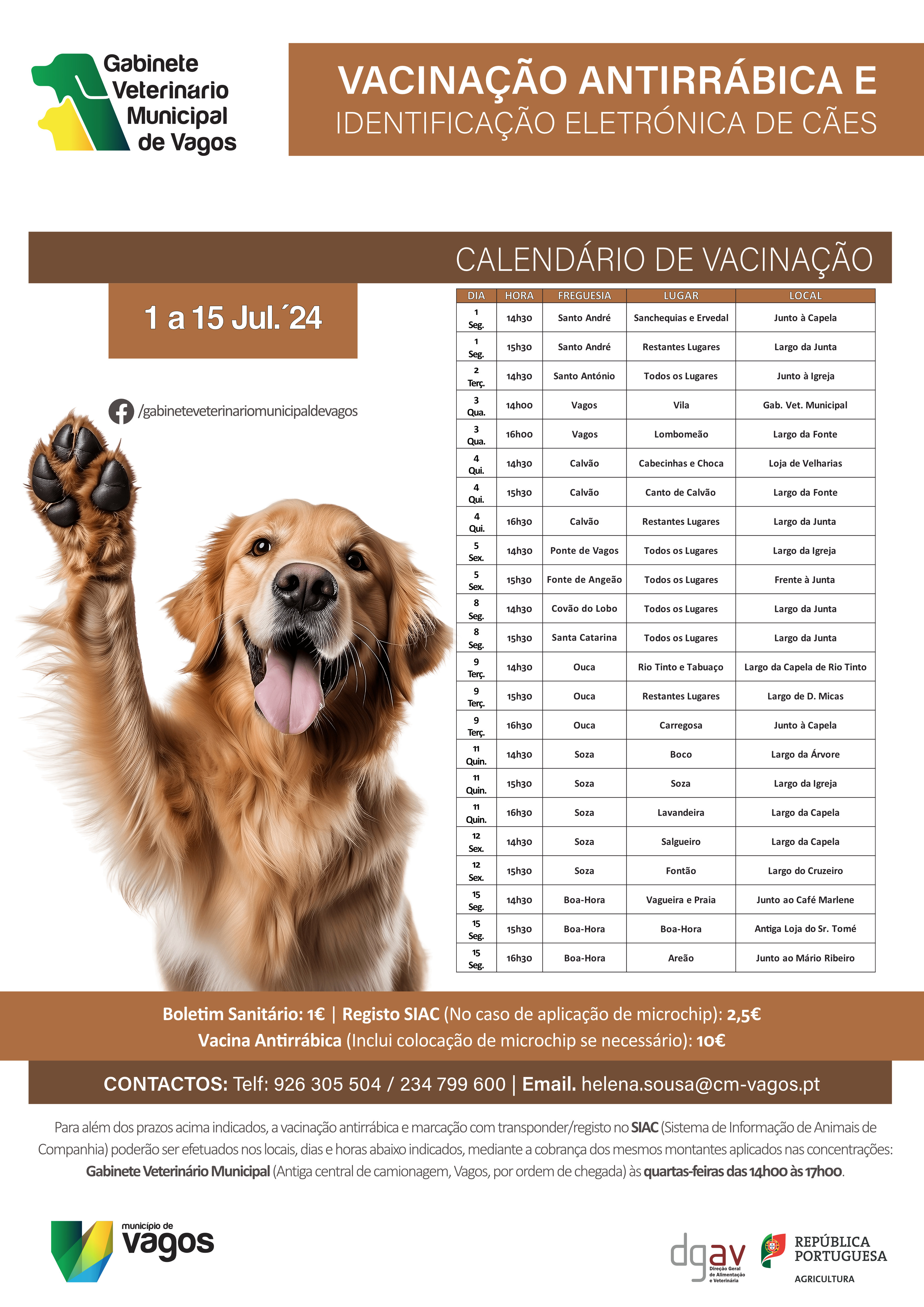 Para além das datas, que se encontram agendadas nesta campanha, poderá, também, vacinar os seus animais no Gabinete Veterinário Municipal em Vagos (na antiga central de camionagem) às quartas-feiras entre as 14h00 e as 17h00 sem necessidade de marcação antecipada.