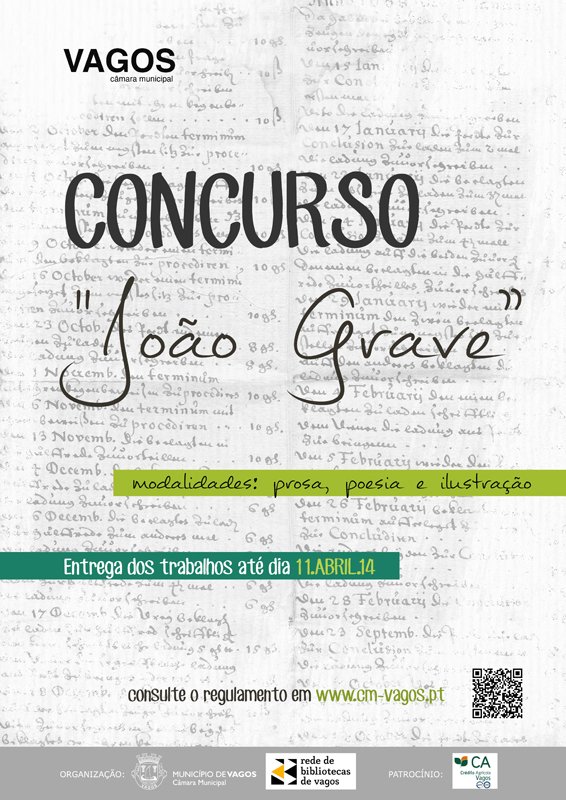 A Câmara Municipal de Vagos, enquanto promotora da Cultura Vaguense e parceira da comunidade educativa do concelho, encontra-se a promover, juntamente com a Rede de Bibliotecas de Vagos, o concurso “João Grave” que, este ano, conta com novas modalidades: Prosa, Poesia e Ilustração.