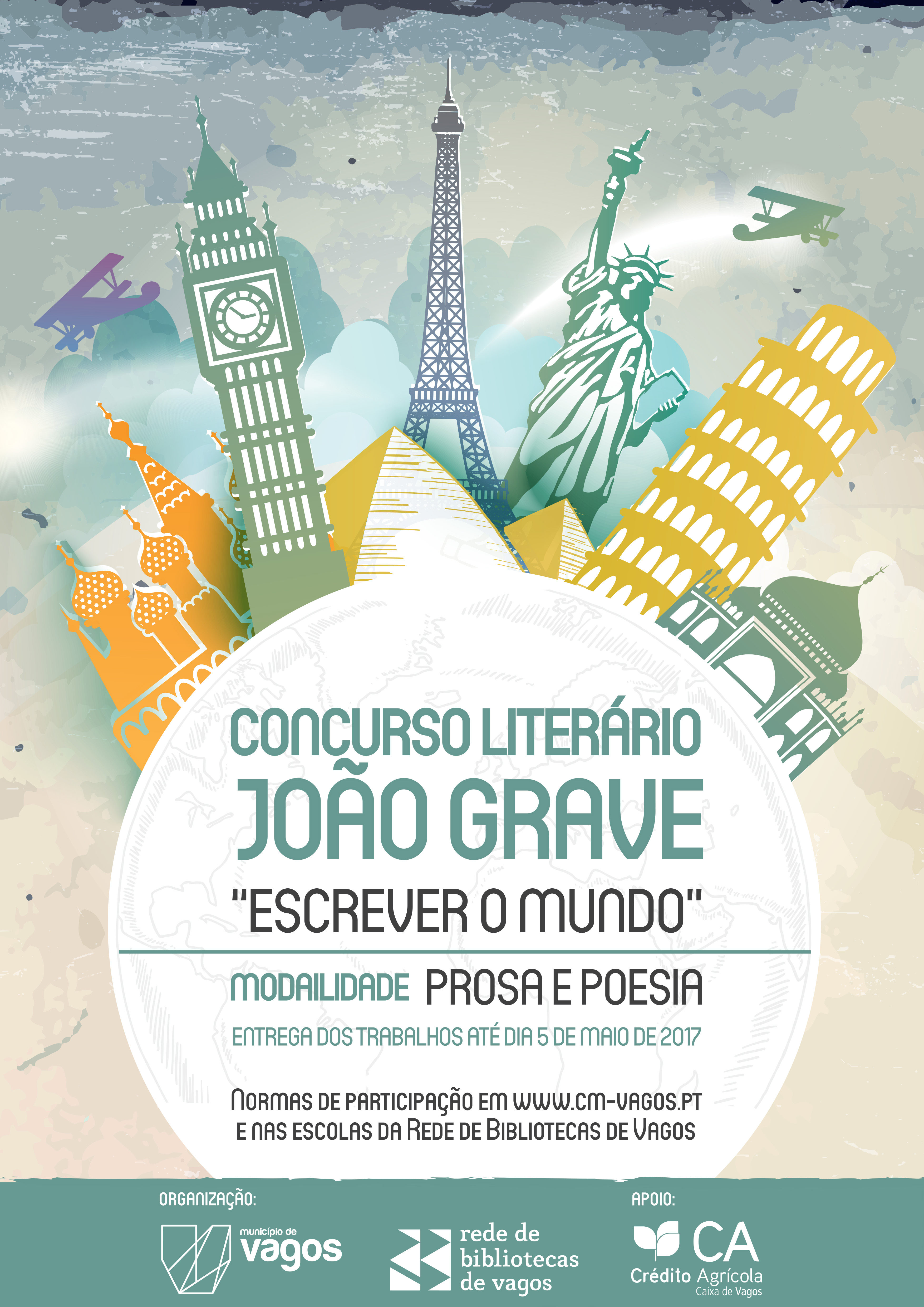 A Câmara Municipal de Vagos, enquanto promotora da Cultura Vaguense e parceira da comunidade educativa do concelho, encontra-se a promover, juntamente com a Rede de Bibliotecas de Vagos, o Concurso Literário “João Grave” que, este ano, estará subordinado ao tema “Escrever o Mundo” e terá como modalidades a prosa e poesia. O presente concurso tem como objetivos desenvolver e consolidar competências de utilização eficaz da palavra escrita em diferentes vertentes literárias, incentivar a criatividade e estimular o envolvimento efetivo da população escolar. O concurso está aberto a toda a população escolar do concelho de Vagos e distribuído em várias categorias: Educação pré-escolar (categoria A), 1.º ensino básico (categoria B), 2.º ensino básico (categoria C), 3.º ensino básico (categoria D), Ensino secundário (categoria E), Alunos com Currículo Específico Individual (CEI) (categoria F) Os textos a concurso deverão ser entregues até ao dia 5 de maio de 2017. Esta iniciativa conta com o apoio da Caixa de Crédito Agrícola de Vagos. Para mais informações o regulamento: