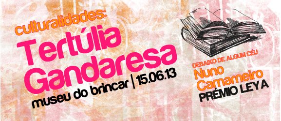 No âmbito do projeto “Culturalidades...sentir a cultura”, que tem vindo a decorrer ao longo dos meses de abril e maio, irá realizar-se, no próximo dia 15 de junho de 2013, a “Tertúlia Gandaresa”, no Museu do Brincar. O presente evento tem início pelas 16h, com a apresentação de vários livros, com destaque para o livro de Nuno Camarneiro “ Debaixo de Algum Céu” , merecedor do prémio Leya. Serão apresentados, também, os livros, não menos importantes, de Idalécio Cação e Victor Fernandes, sob o título “Antologia – Ficcionistas Gandareses”, “Terra Incógnita”, de Paulo frade e “Gandarilhos de Napoleão”, de Silvério Manata. Após a apresentação dos livros, haverá um concerto “clarinetes ad libitum”, com início previsto para as 17h. Aguardamos a sua presença.
