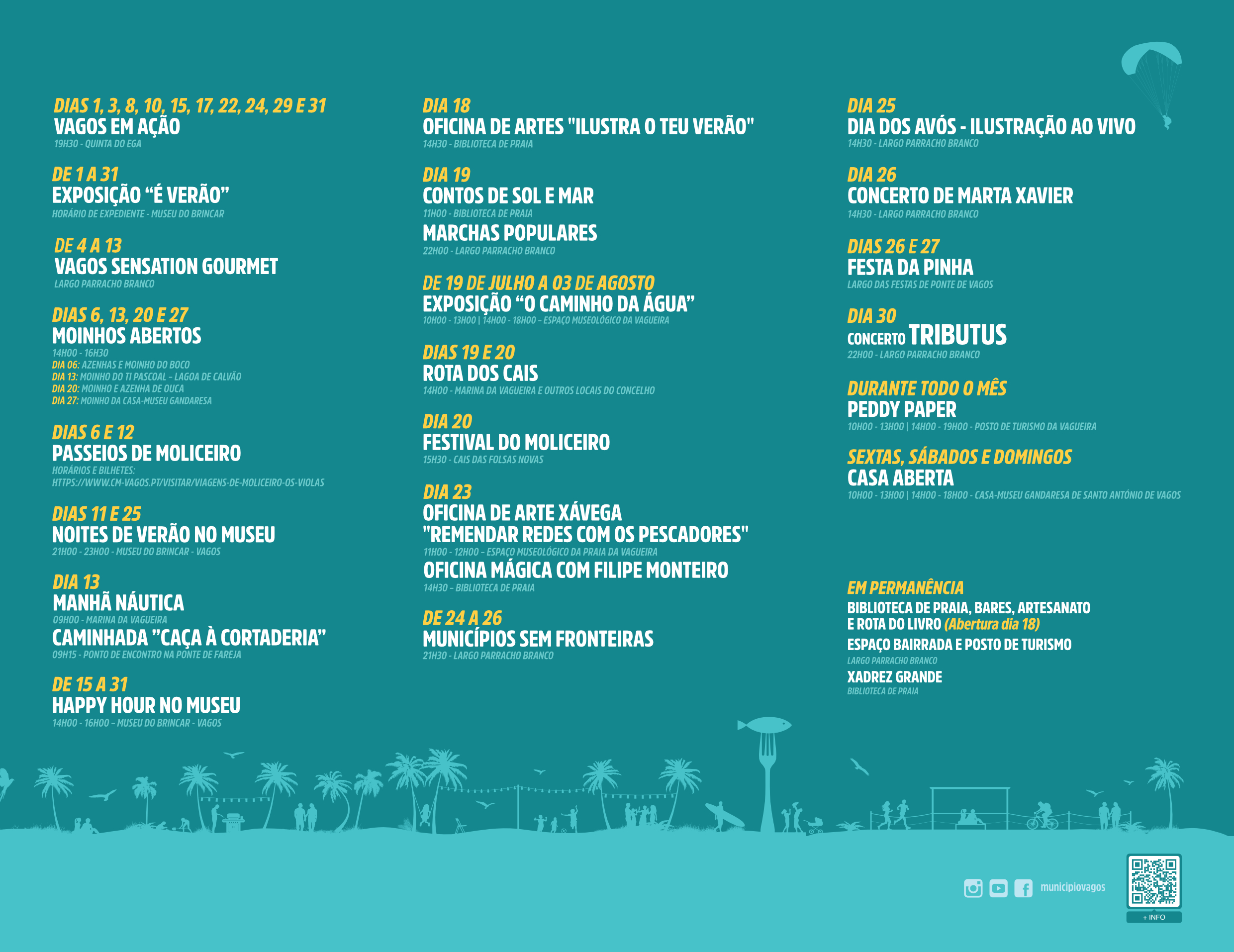 Ainda e durante todo o mês em permanência poderá visitar o Espaço Bairrada, o Posto de Turismo da Vagueira, o Xadrez Grande, junto à Biblioteca de Praia, Bares, Artesanato e a Rota do Livro, que terão início no dia 18 de julho, no Largo Parracho Branco.