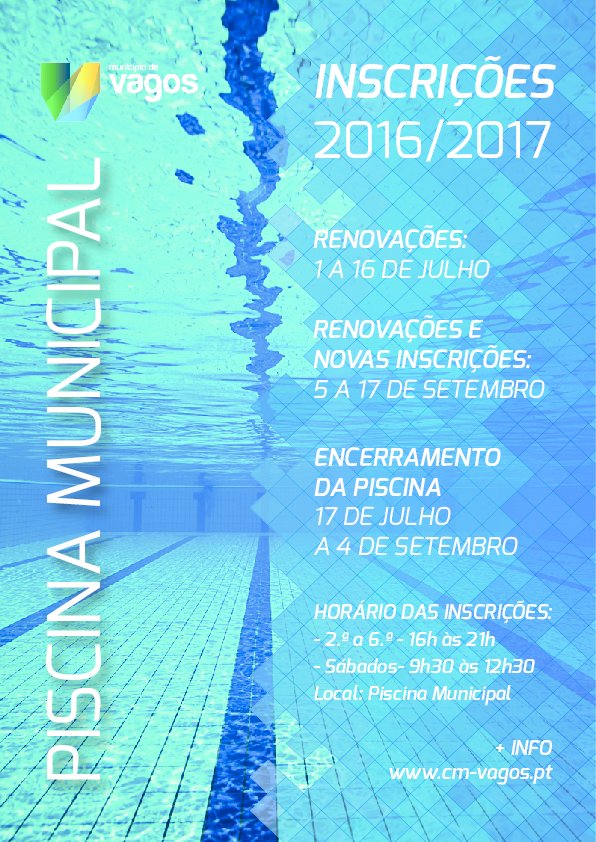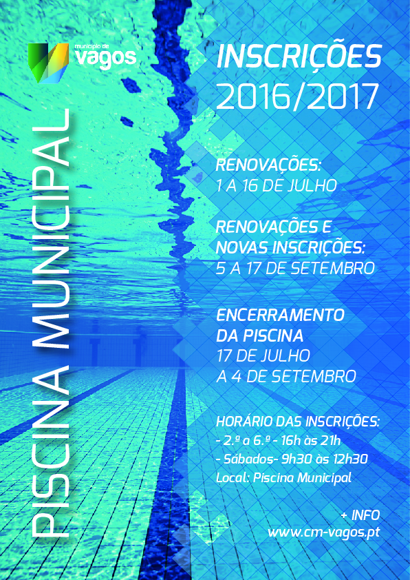 As inscrições para a época 2016/2017 da Piscina Municipal de Vagos decorrerão de 1 a 16 de julho, para renovações, e de 5 a 17 de setembro para renovações e novas inscrições.