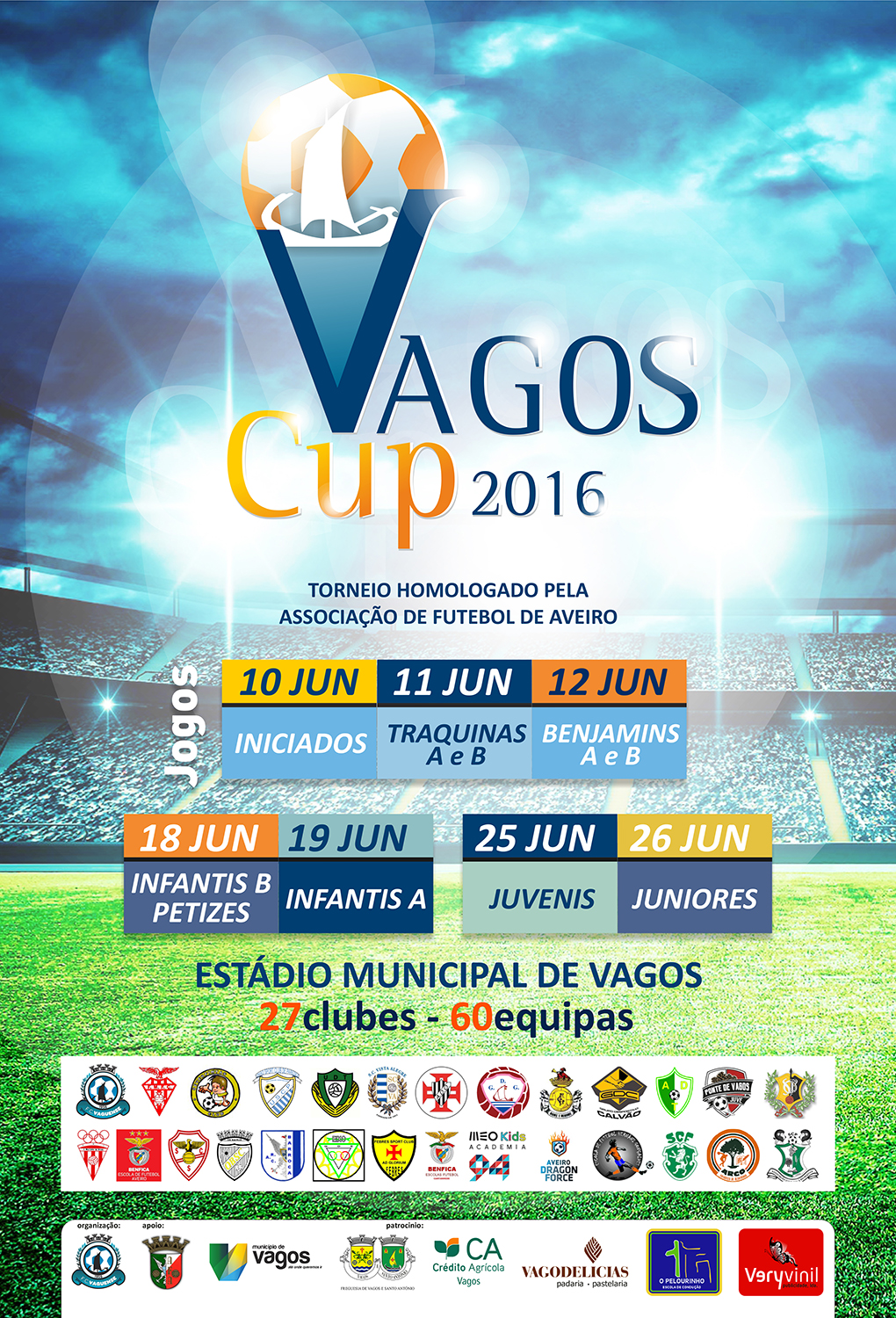 A 4.ª edição do Vagos Cup | Futebol de Formação vai decorrer de 10 a 26 de junho e envolverá 27 clubes e 60 equipas de todos os escalões de formação até aos juniores, juntando mais de 1150 atletas no Estádio Municipal de Vagos.