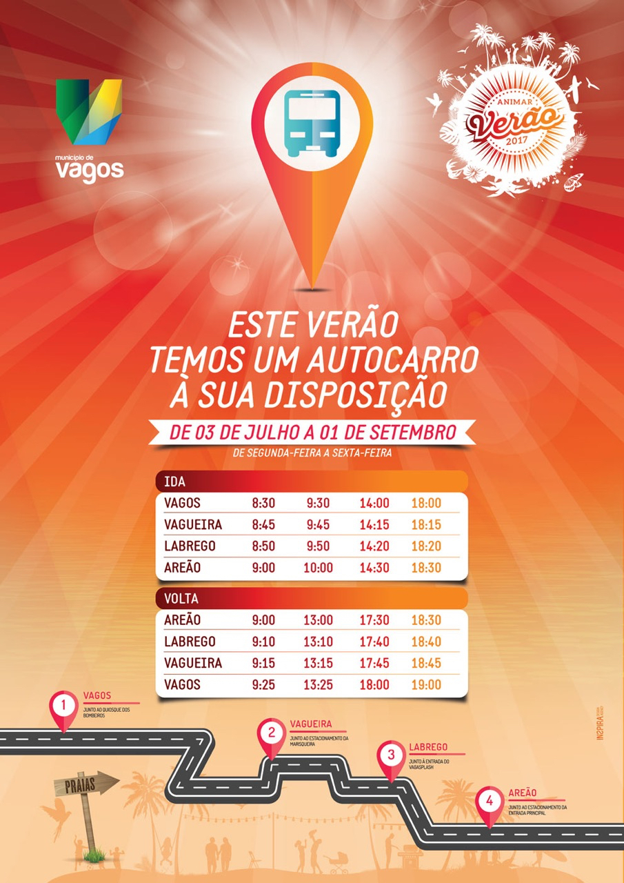 De 3 de julho a 1 de setembro de 2017, teremos um autocarro que fará a ligação Vagos – Praias, de 2.ª a 6.ª feira.