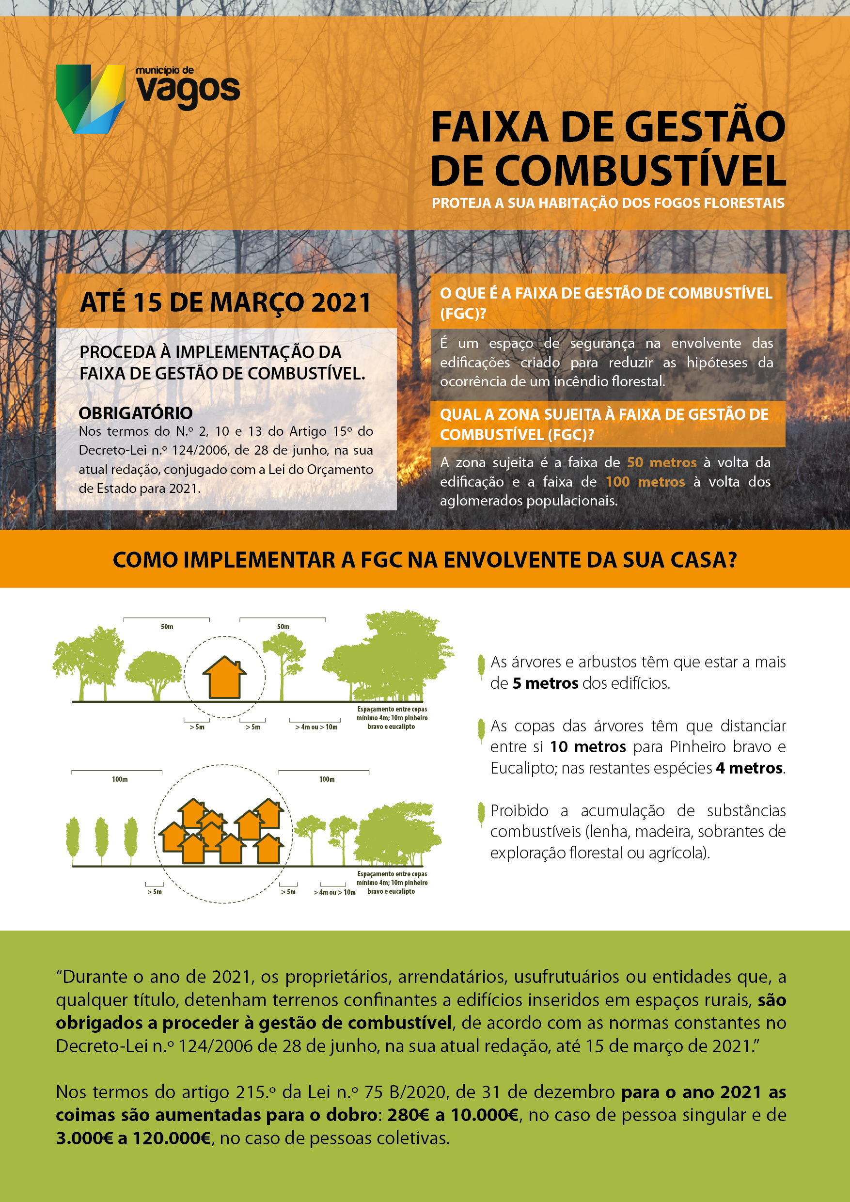 Até dia 15 de março de 2021 é obrigatório, nos termos do nº 2, 10 e 13 do Artigo 15º do Decreto-Lei n.º 124/2006, de 28 de junho, na sua atual redação, conjugado com a Lei do Orçamento de Estado para 2021, proceder à implementação da faixa de gestão de combustível.
