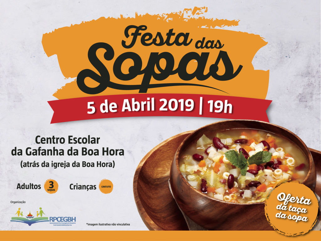 Os Representantes Pais Centro Escolar Gaf. da Boa Hora irão realizar no próximo dia 5 de abril a Festa das Sopas. Com esta atividade os pais pretendem ajudar a Direção da escola na realização de actividades lúdicas, didáticas e recreativas, ou na aquisição de equipamentos, com o objectivo de proporcionar a todas as crianças novas experiências e aprendizagens, de uma forma gratuita ou pouco onerosa.