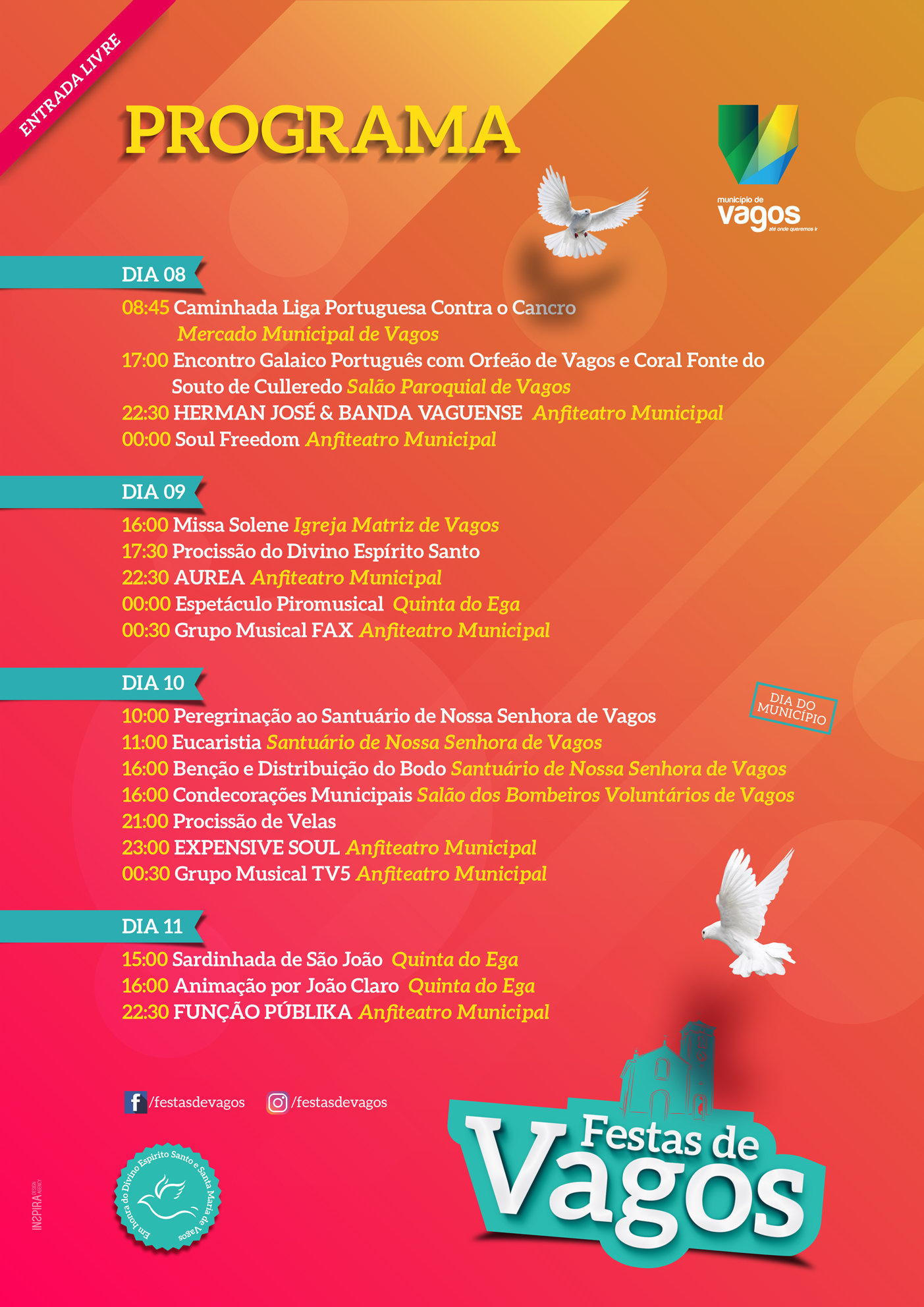 - Dia 08: Caminhada Liga Portuguesa Contra o Cancro, com saída do Mercado Municipal de Vagos, pelas 08h45; Encontro Galaico Português com Orfeão de Vagos e Coral Fonte do Souto de Culleredo, no Salão Paroquial de Vagos, pelas 17h00; Atuação de Herman José e Banda Vaguense, no Anfiteatro Municipal, pelas 22h30; Atuação dos Soul Freedom, no Anfiteatro Municipal, pelas 00h00.