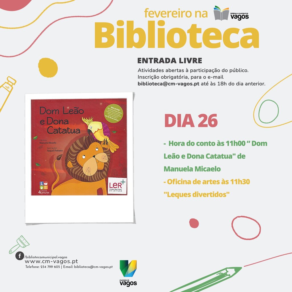 - Hora do conto às 11h00 com a história: “Dom Leão e Dona Catatua" de Manuela Micaelo.