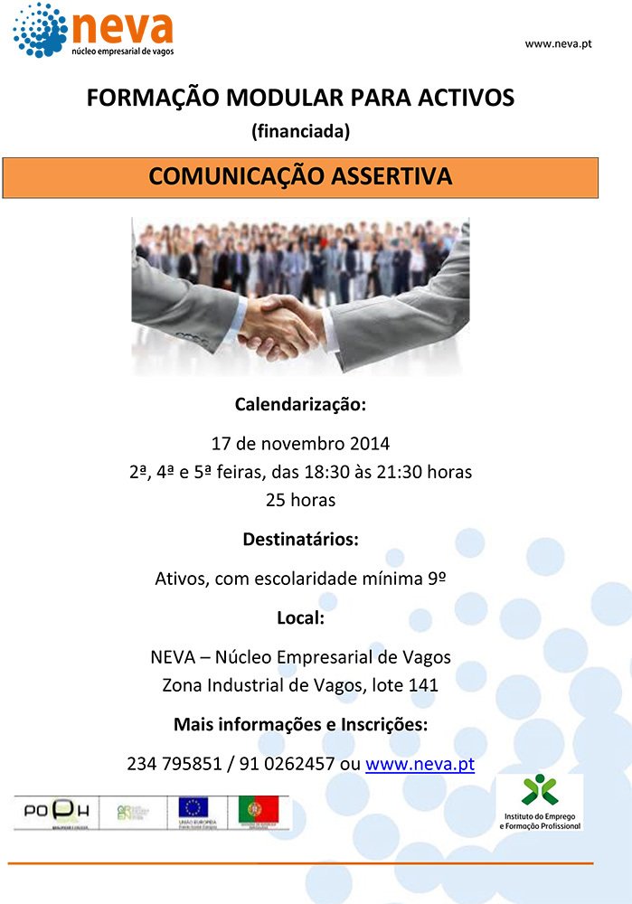 Venha aprender algumas dicas que permitem uma maior eficácia no processo de comunicação, bem como desenvolver estilos de comportamento assertivos. Participe nesta formação que decorre de 17 de novembro a 3 de dezembro 2014, no Núcleo Empresarial de Vagos, destinada a ativos com escolaridade mínima 9º ano.
