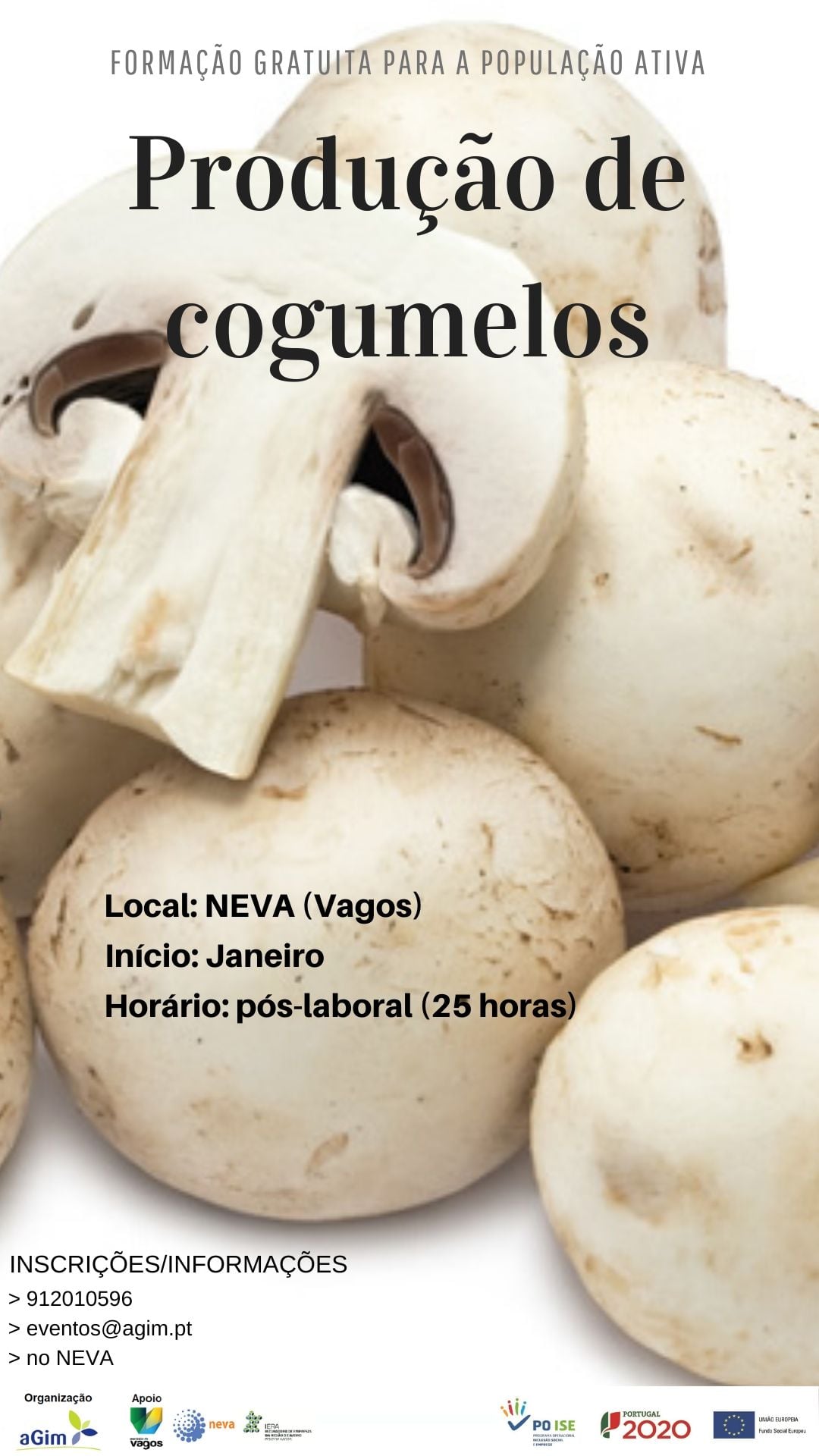 A Agim – Associação para os Pequenos Frutos e Inovação Empresarial vai organizar uma formação de produção de cogumelos a realizar nas instalações do NEVA, na Zona Industrial de Vagos, com início a 30 de janeiro.