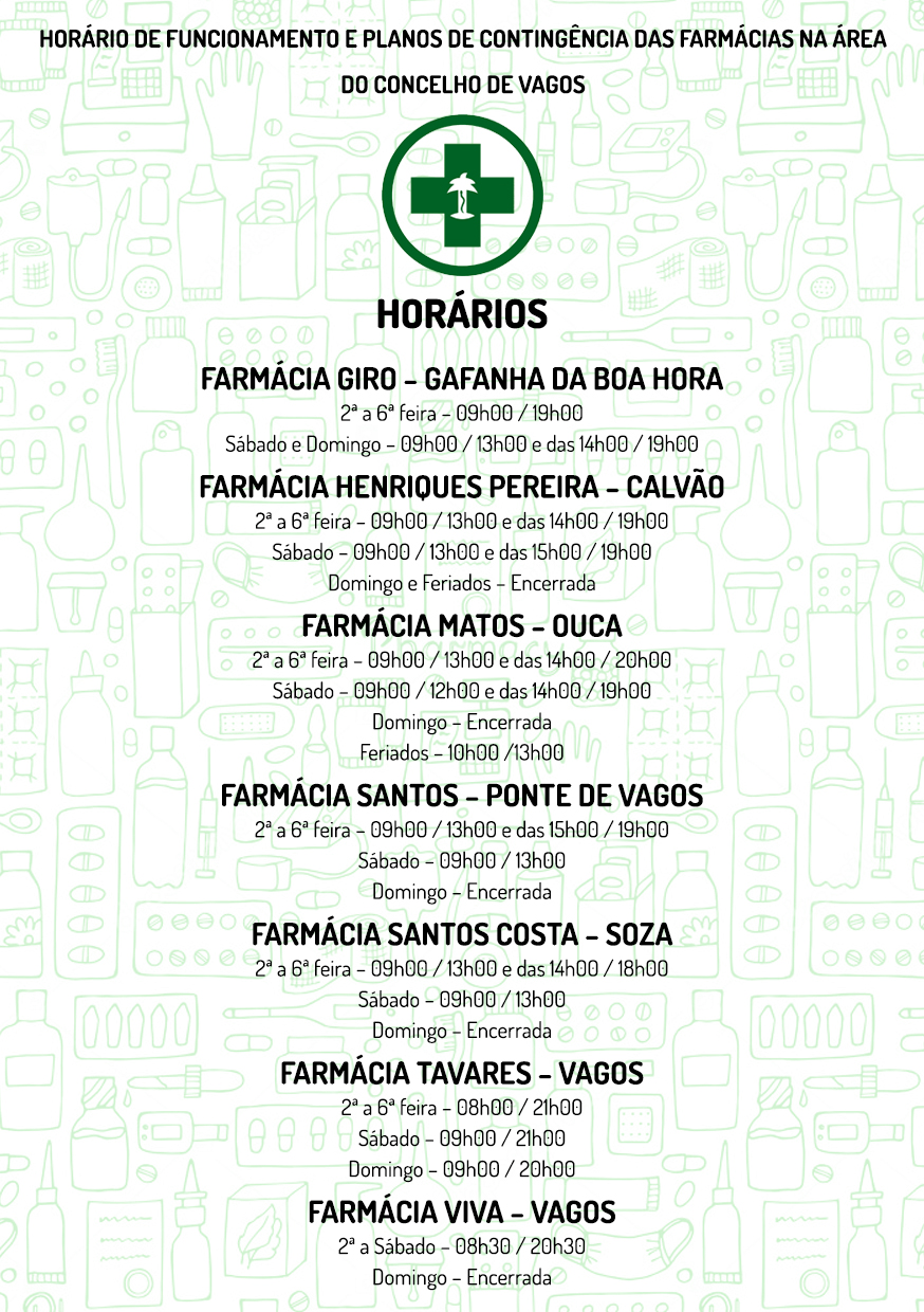 HORÁRIO DE FUNCIONAMENTO E PLANOS DE CONTINGÊNCIA DAS FARMÁCIAS NA ÁREA DO CONCELHO DE VAGOS