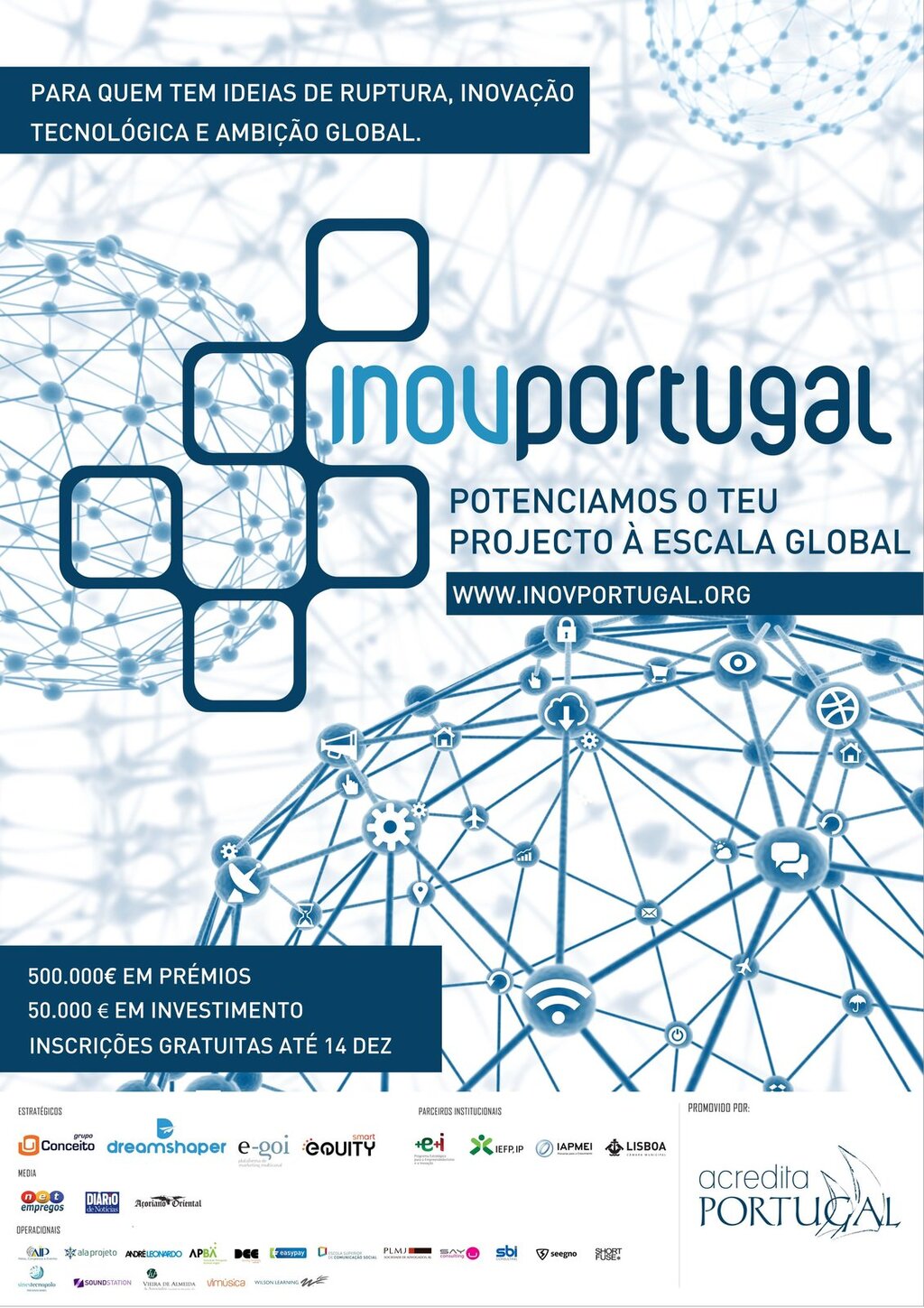 No âmbito do apoio a candidaturas a concursos de empreendedorismo e inovação o concurso de empreendedorismo “InovPortugal”, organizado pela Associação Acredita Portugal, tem candidaturas abertas e gratuitas até dia 14 de dezembro de 2014. O objetivo é premiar projetos de rutura, inovação tecnológica e ambição global. http://www.inovportugal.org/