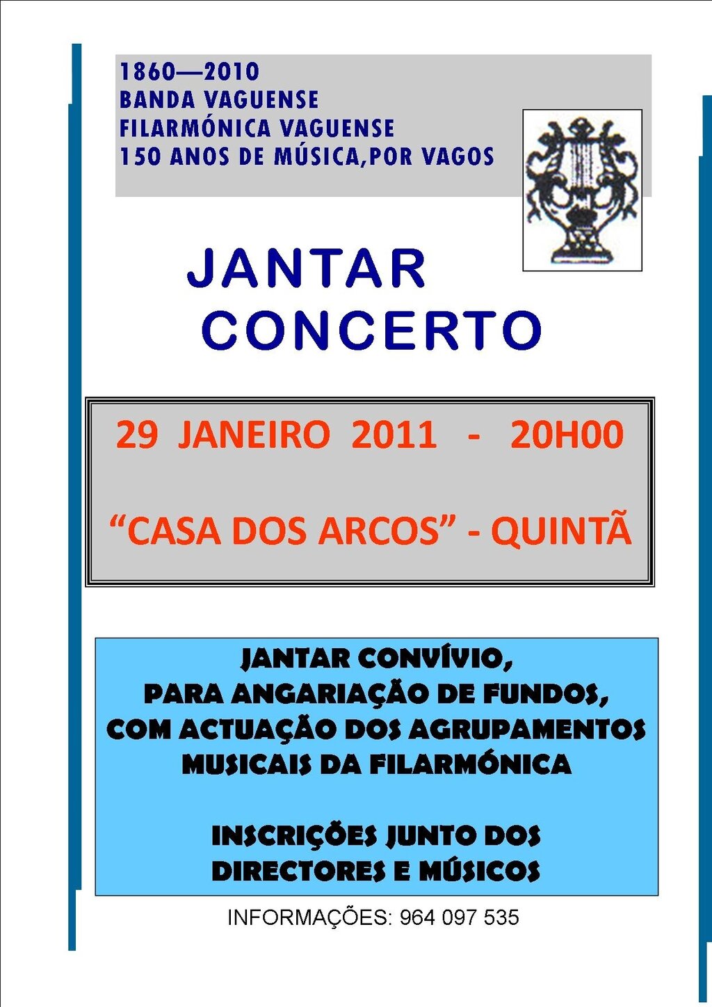 Realizar-se-á, no próximo dia 29 de Janeiro de 2011, pelas 20h, o Jantar Concerto da Filarmónica Vaguense, na “Casa dos Arcos”, Quintã. Neste jantar, que tem como principal objectivo a angariação de fundos, actuarão os vários agrupamentos musicais que compõem a Filarmónica. As inscrições são efectuadas juntos dos directores e músicos da respectiva Filarmónica.