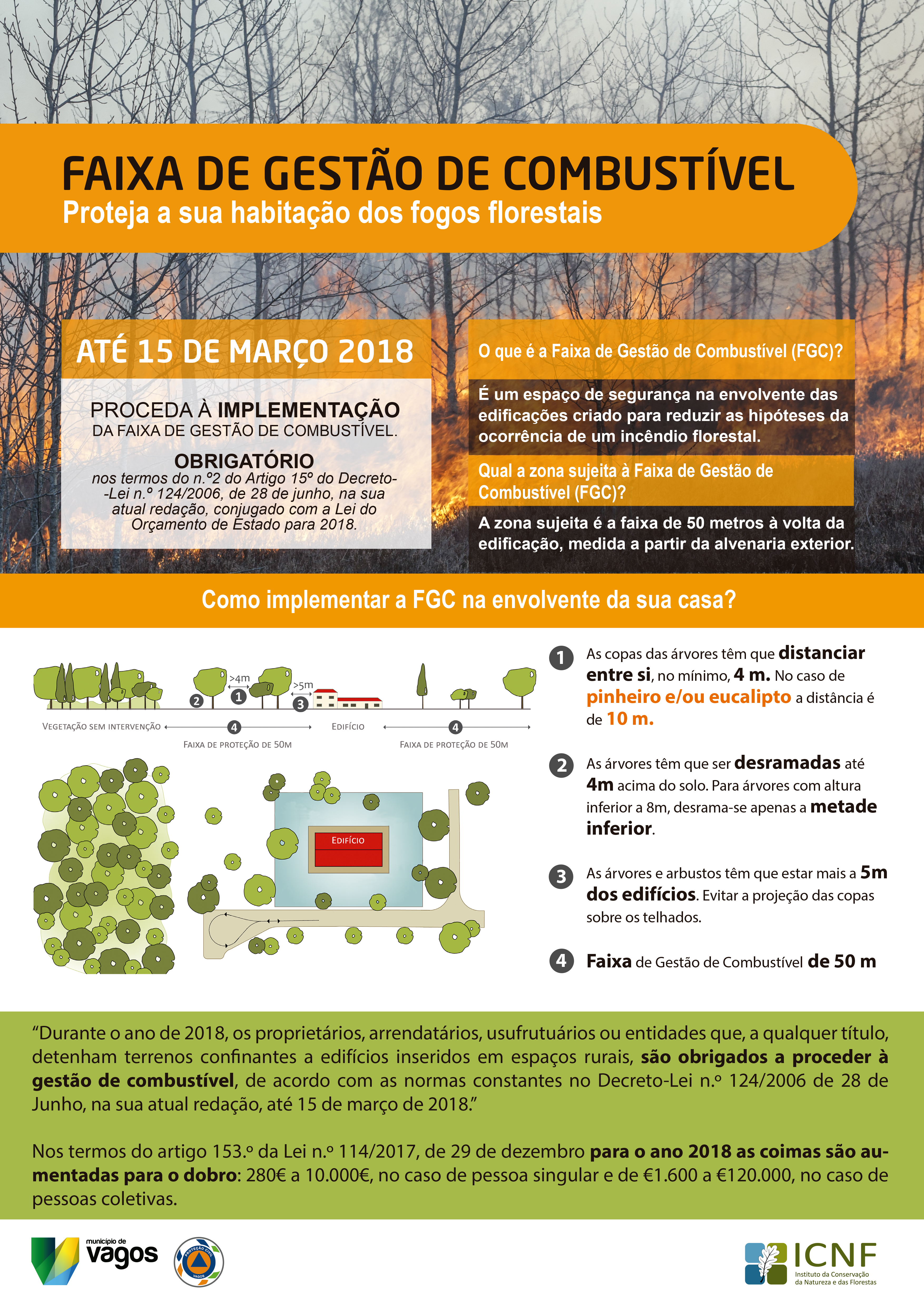 A Câmara Municipal de Vagos está, através do Gabinete de Proteção Civil, Gabinete Técnico Florestal e Núcleo de Fiscalização, a proceder à verificação no terreno do cumprimento da limpeza das Faixas de Gestão de Combustível na envolvente das edificações isoladas.