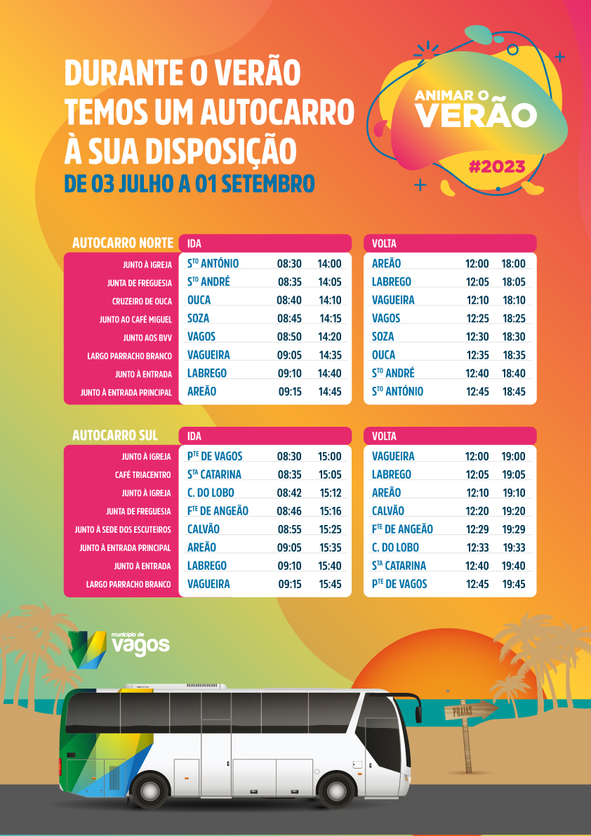 Tal como tem acontecido em anos anteriores, em 2023, o Município de Vagos vai disponibilizar, a toda a população do concelho, autocarros gratuitos para as praias do concelho de Vagos, nomeadamente a Praia do Areão, a Praia do Labrego e a Praia da Vagueira.