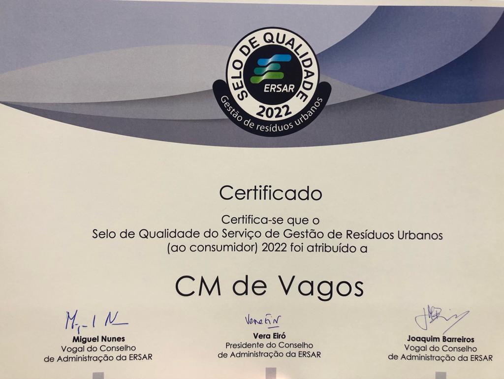 Na passada sexta-feira, o Município de Vagos foi distinguido com o Selo de Qualidade do Serviço de Gestão de Resíduos Urbanos (ao consumidor) pela Entidade Reguladora de Águas e Resíduos (ERSAR).