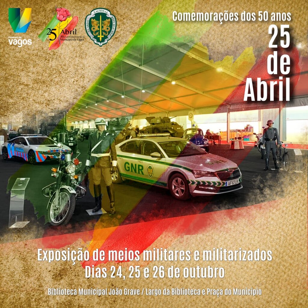 Dando continuidade ao programa para 2024, evocativo e comemorativo dos 50 anos do 25 de Abril no concelho de Vagos, o Município, em conjunto com a Assembleia Municipal de Vagos e com a Guarda Nacional Republicana, vai levar a cabo uma exposição de meios militares e militarizados desta força policial, alusivos ao período da revolução.
