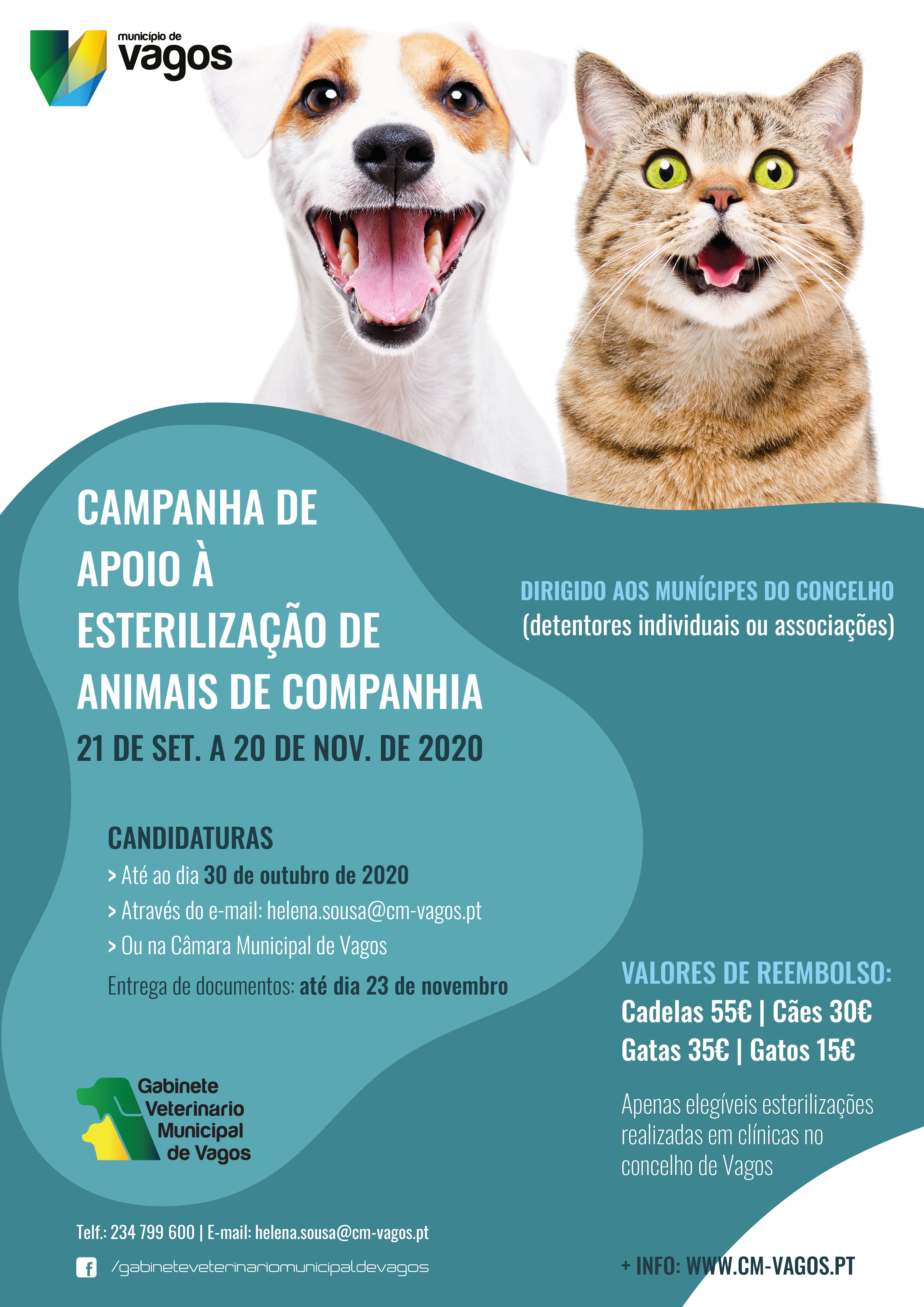 O Município de Vagos lançou um programa extraordinário de apoio à esterilização de animais de companhia (cães e gatos) dirigido aos munícipes do concelho (detentores individuais ou associações) no período de 21 de setembro a 20 de novembro de 2020.