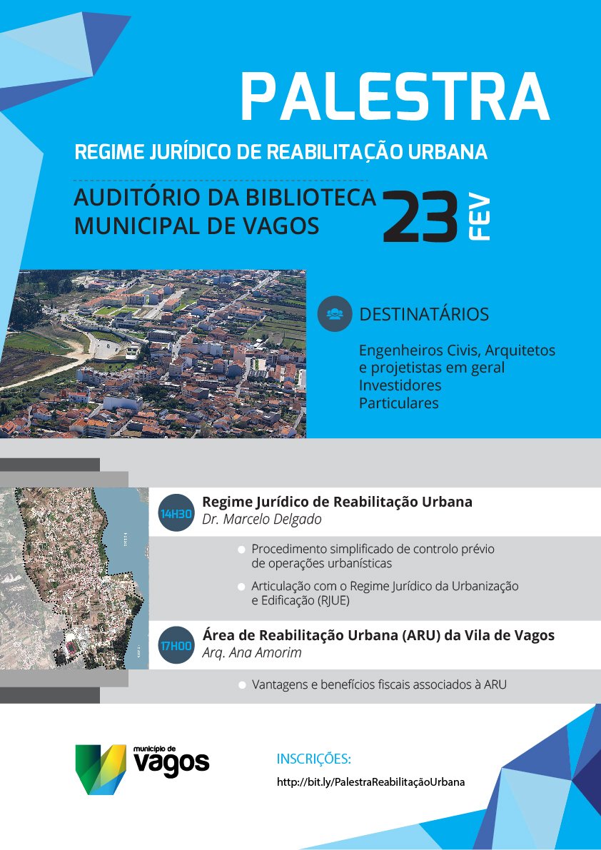 Realiza-se, no próximo dia 23 de fevereiro de 2017, a partir das 14h30, uma Palestra sobre o Regime Jurídico de Reabilitação Urbana, no Auditório da Biblioteca Municipal de Vagos.
