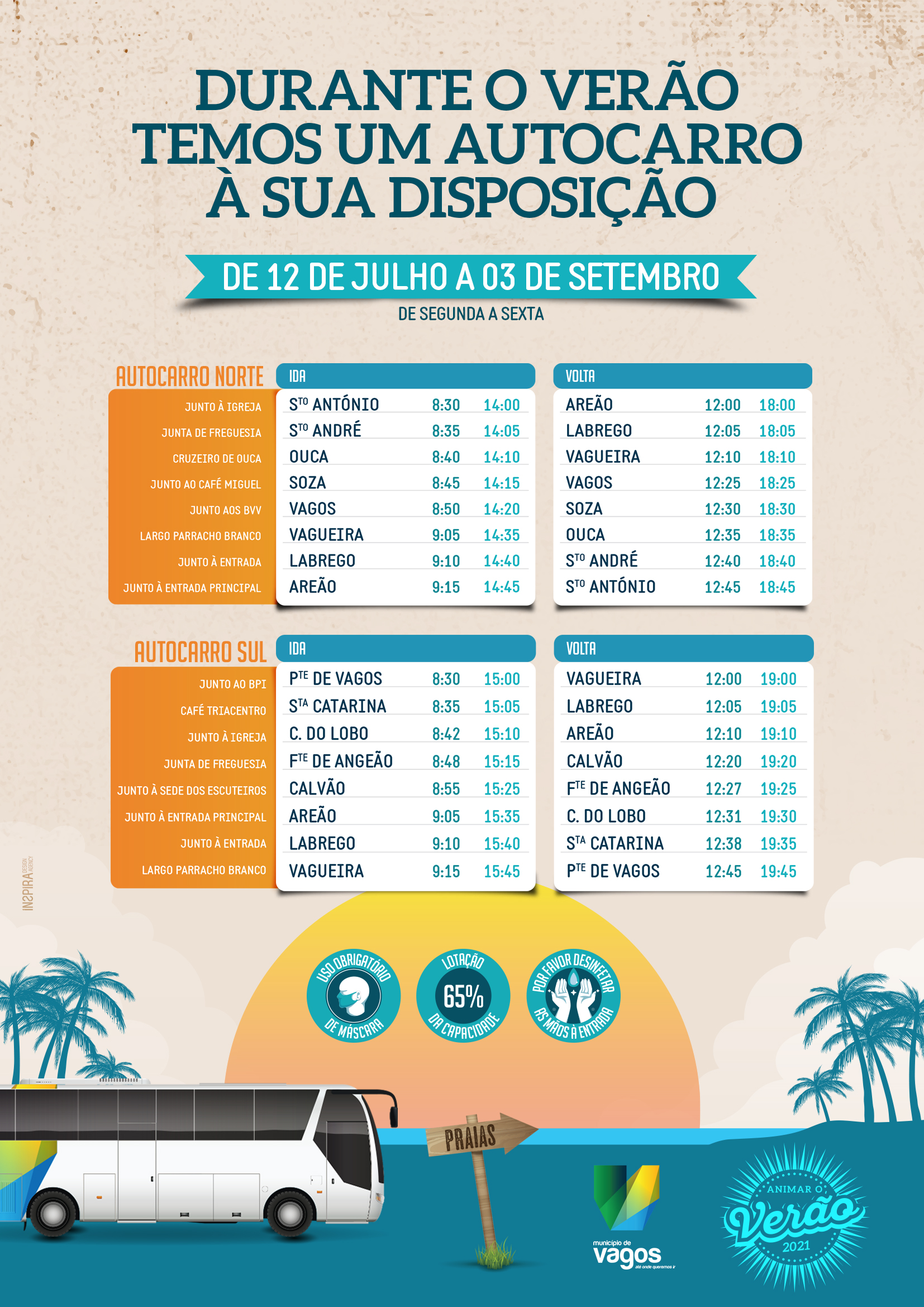 De 12 de julho a 3 de setembro, de segunda a sexta-feira, o Município de Vagos voltará a proporcionar aos munícipes a possibilidade de terem à sua disposição o transporte gratuito de autocarro para as praias do concelho.
