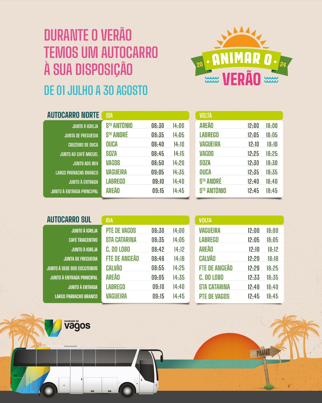 De 1 de julho a 30 de agosto, de segunda a sexta-feira, o Município de Vagos continuará a proporcionar aos munícipes a possibilidade de terem à sua disposição o transporte gratuito de autocarro para as praias do concelho.