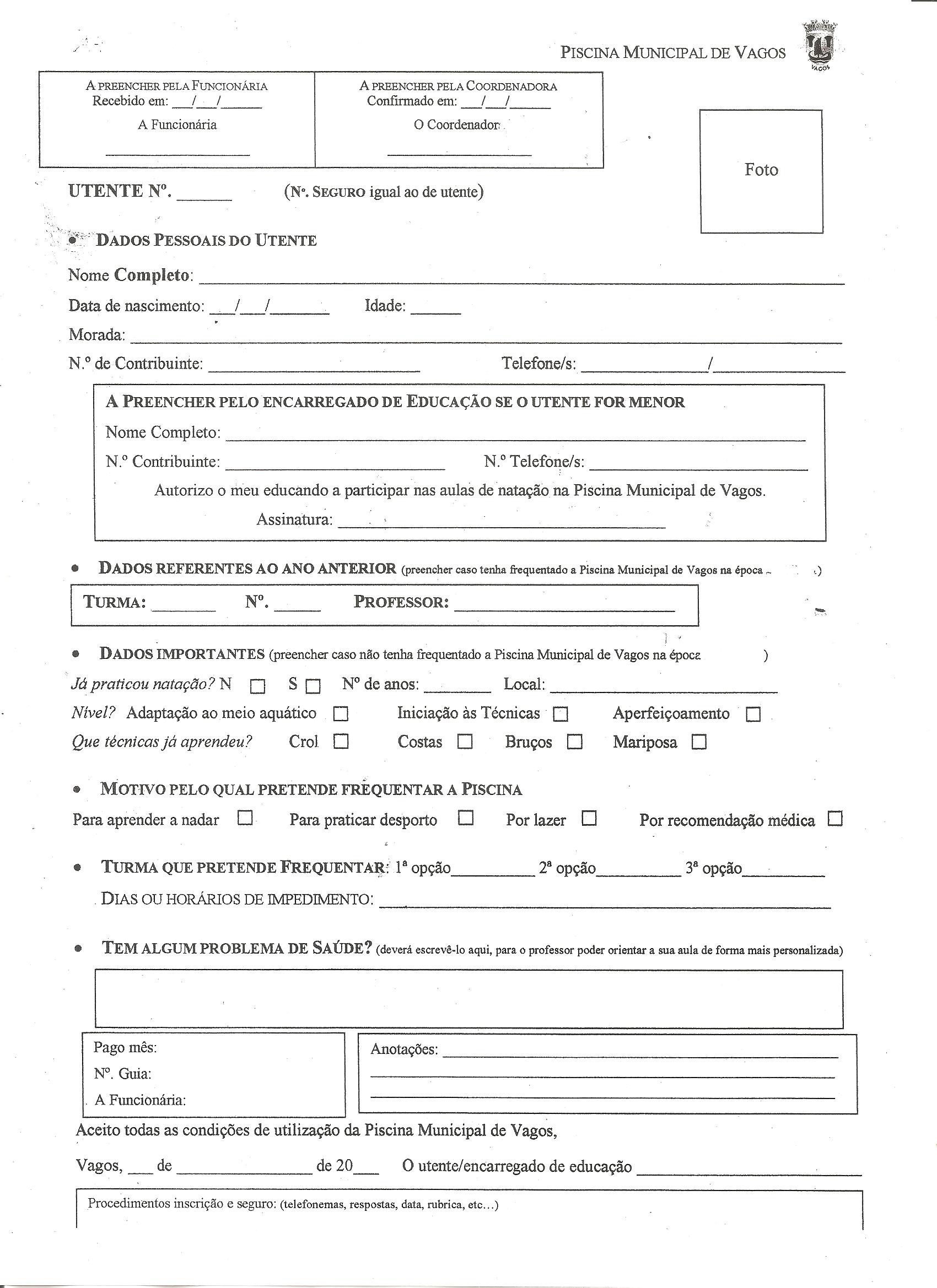 Todos os interessados deverão fazer a sua inscrição na secretaria da Piscina Municipal, ou preencher a ficha que segue em anexo e enviar para desporto@cm-vagos.pt.