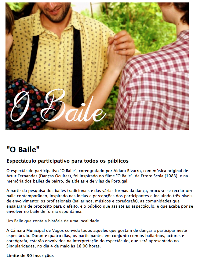 O espectáculo participativo “O Baile”, coreografado por Aldara Bizarro, com música original de Artur Fernandes (Danças Ocultas), foi inspirado no filme “O Baile”, de Ettore Scola (1983), e na memória dos bailes de bairro, de aldeias e de vilas de Portugal.
