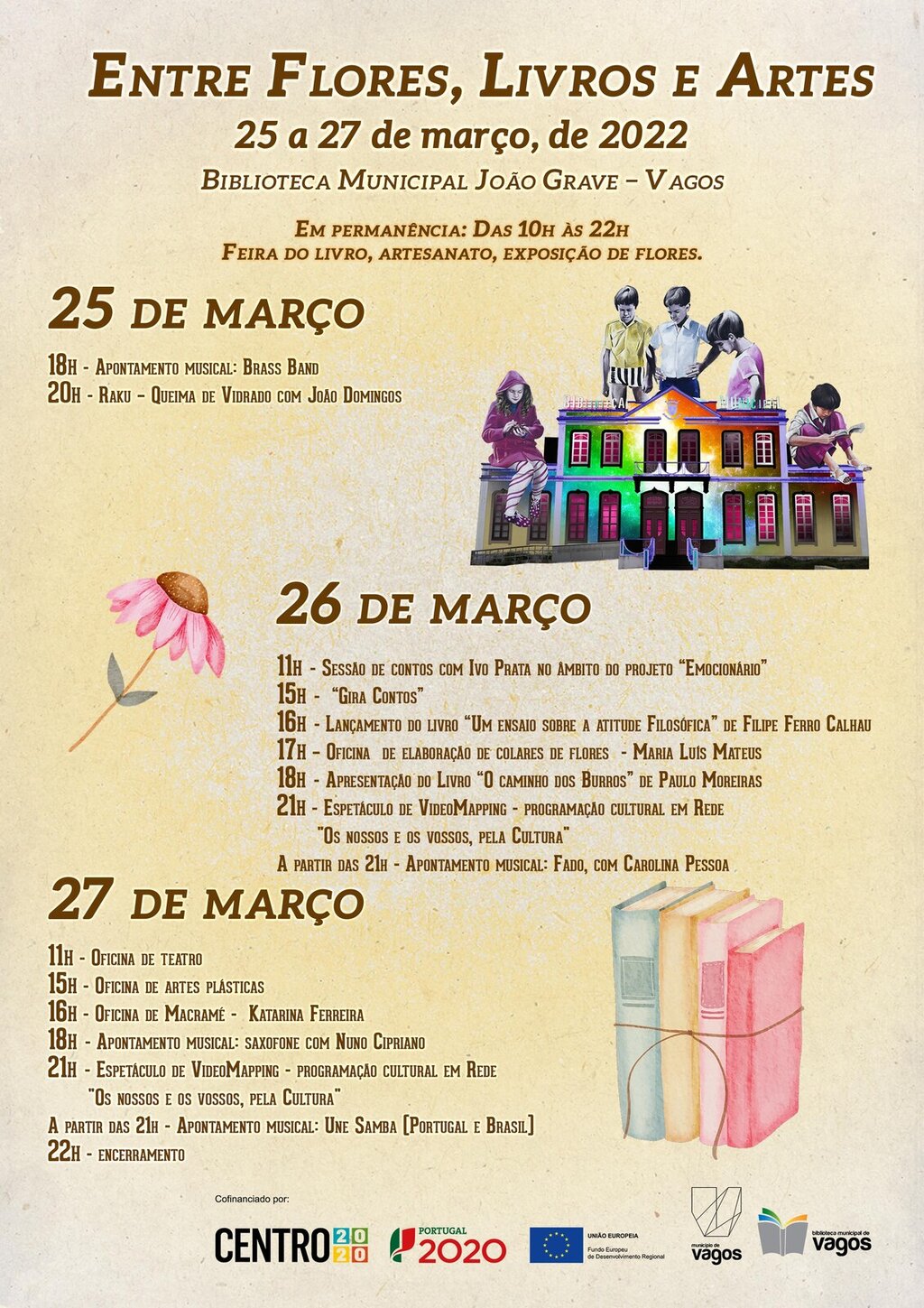 Detalhando as atividades deste evento, o início será marcado no dia 25 de março, às 18h com a interpretação musical de uma Brass Band, seguida da atividade “Raku – Queima de Vidrado” por João Domingos. O dia de sábado, 26 de março, abre às 11h com uma sessão de contos interpretada por Ivo Prata, no âmbito do projeto Emocionário. Pelas 15h realiza-se a atividade “Gira Contos”, seguida da apresentação do livro de Filipe Calhau, intitulado “Um ensaio sobre a atitude filosófica”. Pelas 17h acontece a “Oficina de elaboração de colares de flores” com Maria Luís Mateus, e às 18h apresentação do livro “O caminho dos Burros” de Paulo Moreiras. O destaque deste segundo dia do evento Entre Flores, Livros e Artes está reservado para depois das 21h com a apresentação de um espetáculo de VideoMapping, ao abrigo da Programação Cultural em Rede “Os Nossos e os Vossos pela Cultura” com três projeções de imagens identitárias do Município de Vagos, entre as quais irão acontecer apontamentos de fado com a interpretação de Carolina Pessoa.