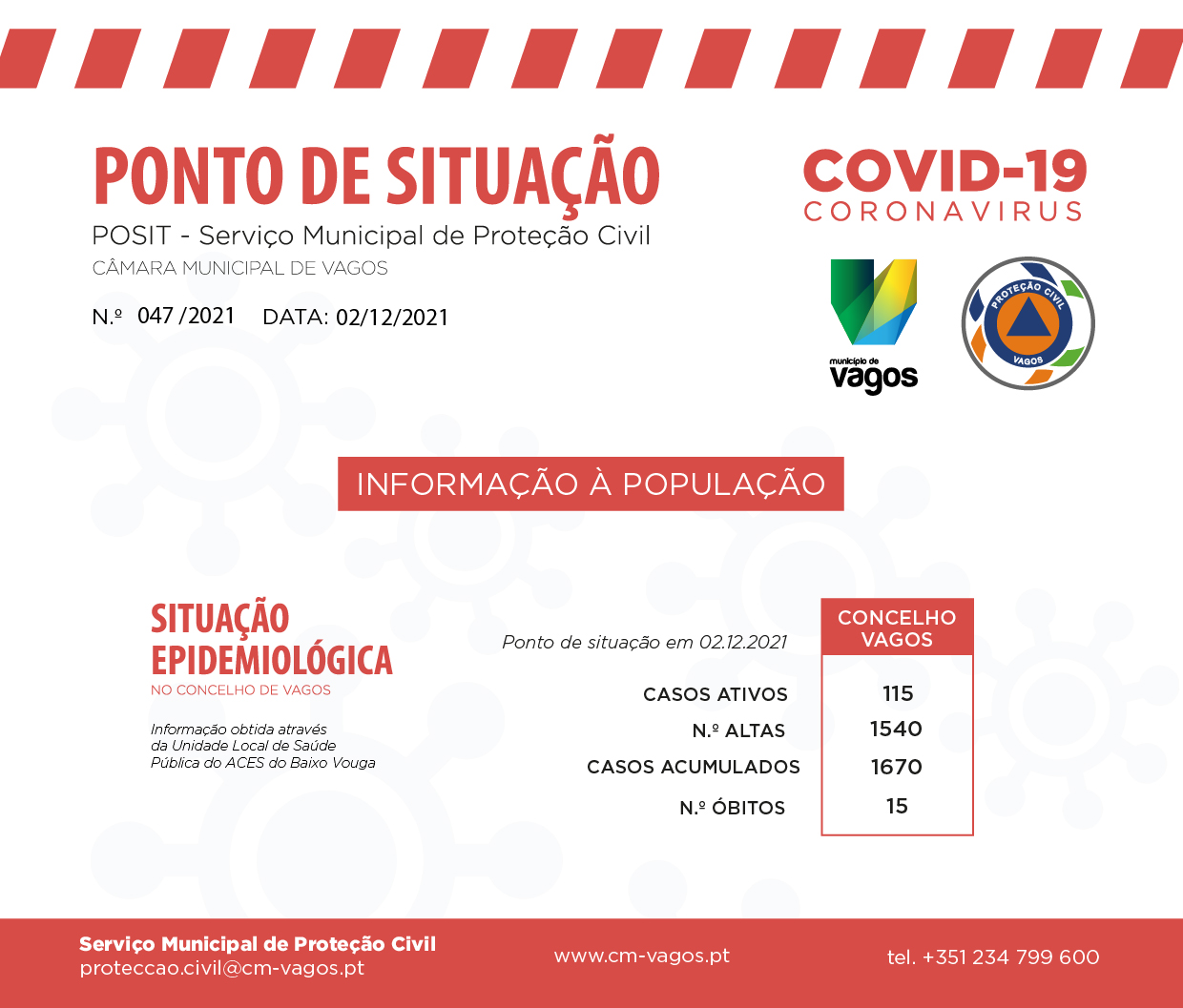 O Serviço Municipal de Proteção Civil da Câmara Municipal de Vagos emitiu, hoje, dia 2 de dezembro de 2021, um novo ponto de situação municipal no âmbito da pandemia COVID-19.