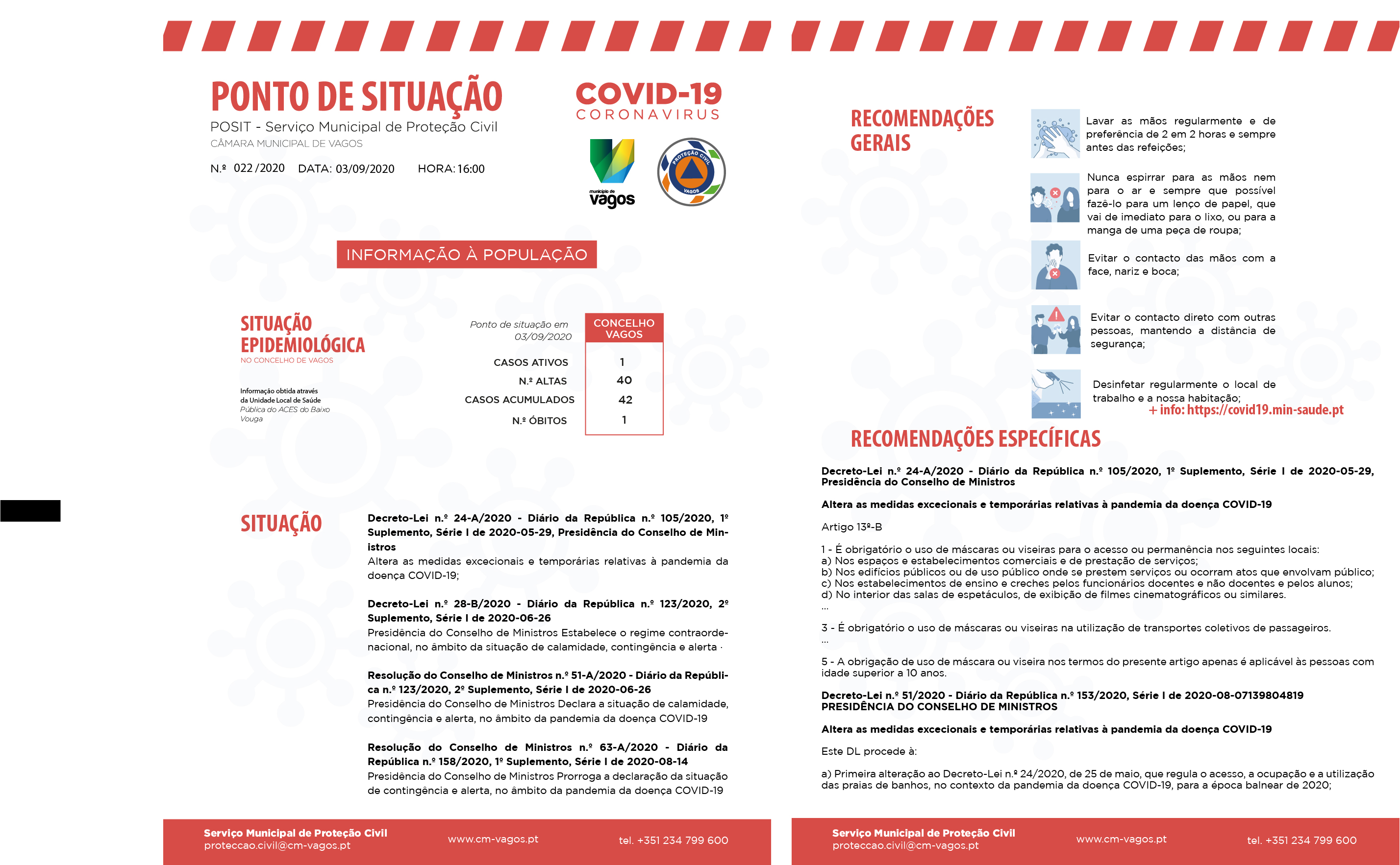 O Serviço Municipal de Proteção Civil da Câmara Municipal de Vagos emitiu, hoje, dia 03 de setembro de 2020, um novo ponto de situação municipal no âmbito da pandemia COVID-19.
