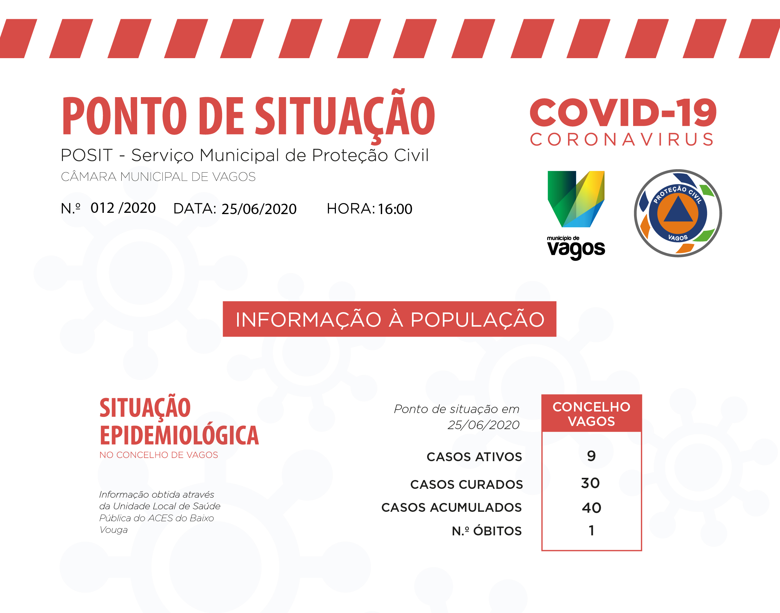 O Serviço Municipal de Proteção Civil da Câmara Municipal de Vagos emitiu, hoje, dia 25 de junho de 2020, um novo ponto de situação municipal no âmbito da pandemia COVID-19.