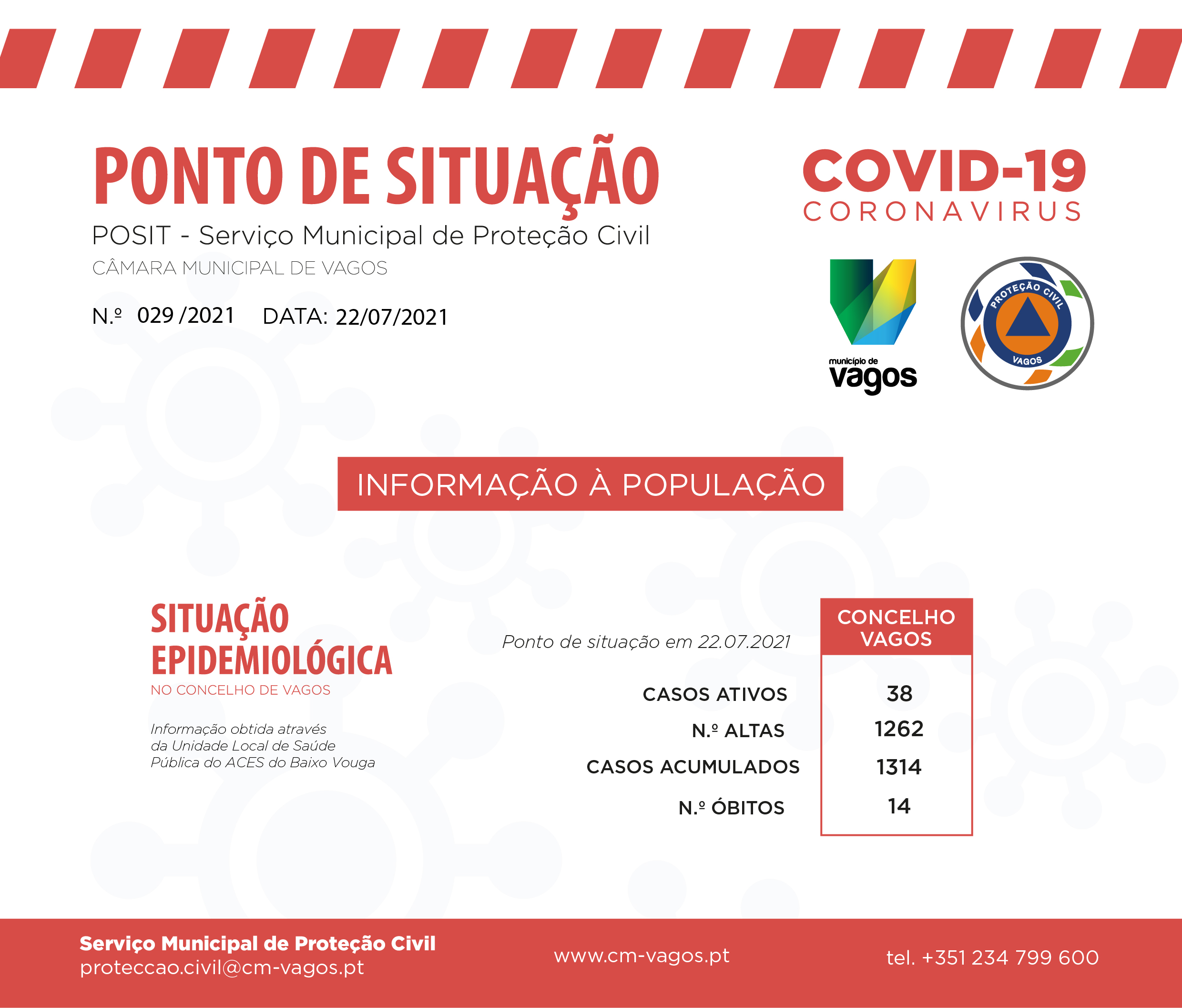 O Serviço Municipal de Proteção Civil da Câmara Municipal de Vagos emitiu, hoje, dia 29 de julho de 2021, um novo ponto de situação municipal no âmbito da pandemia COVID-19.