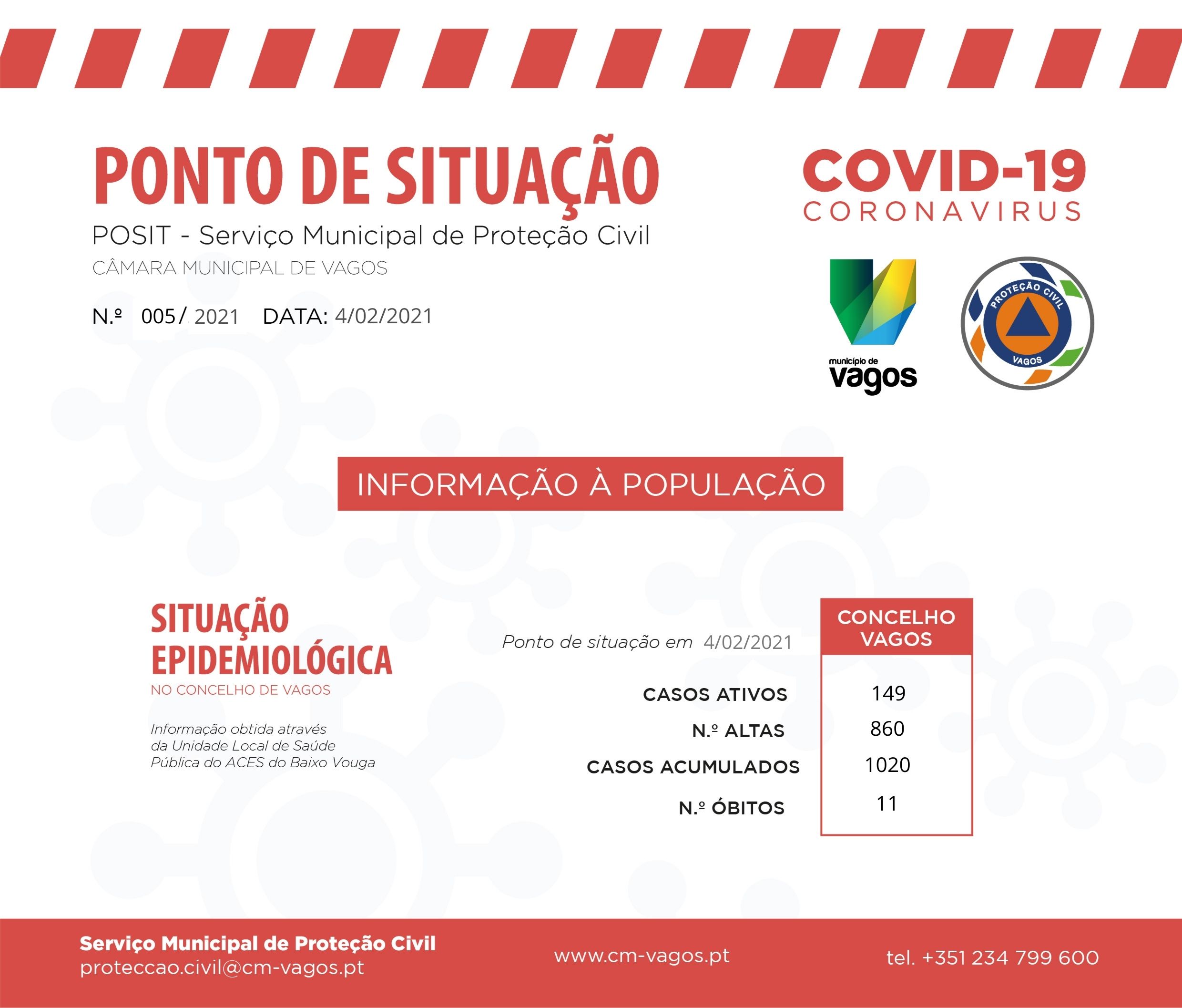 O Serviço Municipal de Proteção Civil da Câmara Municipal de Vagos emitiu, hoje, dia 4 de fevereiro de 2021, um novo ponto de situação municipal no âmbito da pandemia COVID-19.