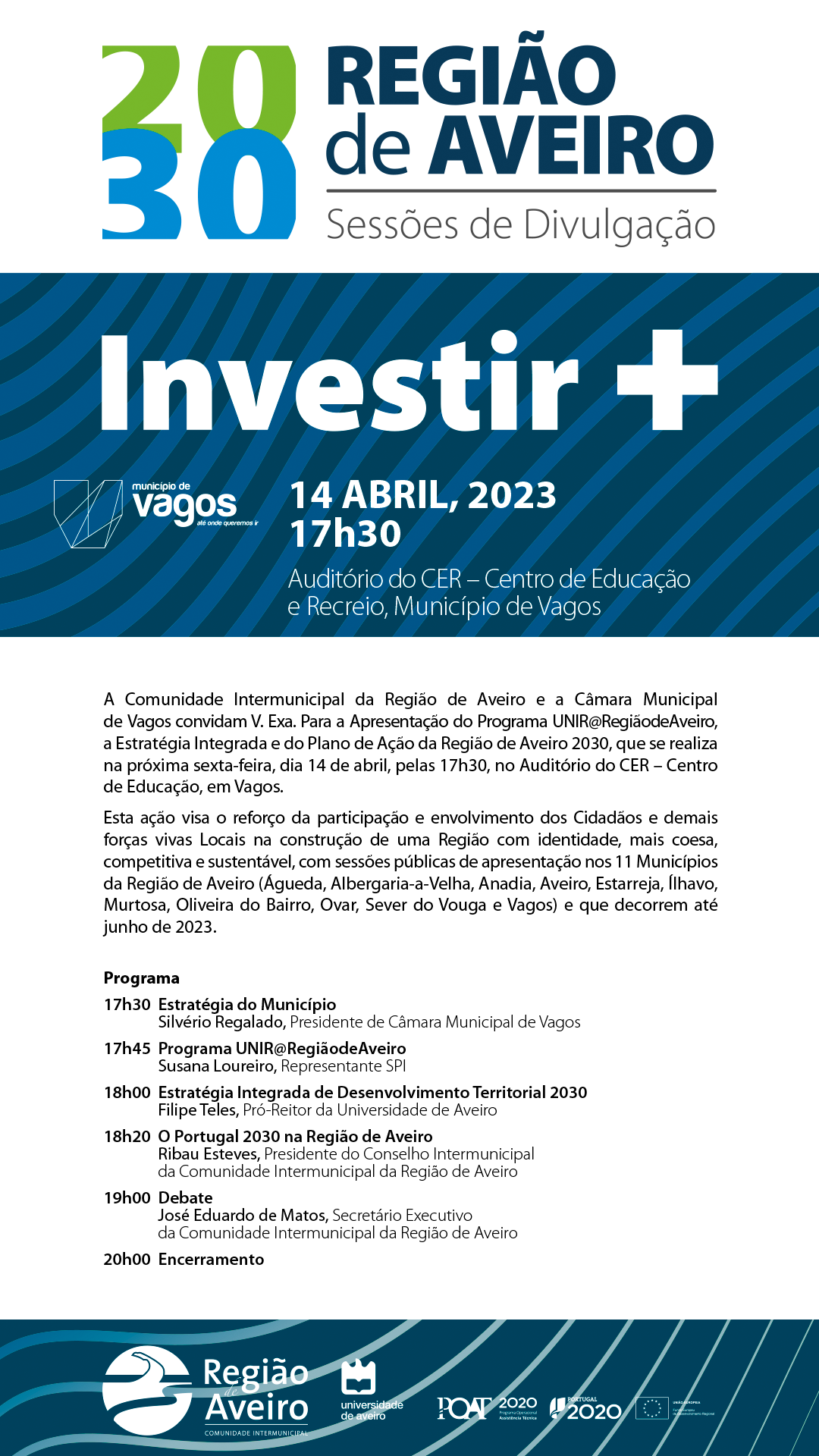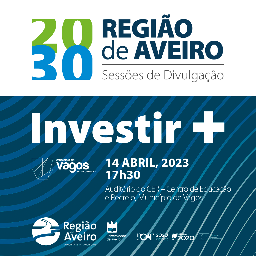 A Câmara Municipal de Vagos irá realizar uma Sessão Pública de Apresentação do Programa UNIR@RegiãodeAveiro, da Estratégia Integrada e do Plano de Ação da Região de Aveiro 20/30, que ocorre no âmbito da Comunidade Intermunicipal da Região de Aveiro, no próximo dia 14 de abril, às 17h30, no Centro de Educação e Recreio de Vagos. Para a Comunidade Intermunicipal da Região de Aveiro (CIRA), a Estratégia Integrada de Desenvolvimento Territorial 2030 é uma peça central no posicionamento da Região, no quadro do novo período de Programação de Fundos Comunitários – PORTUGAL 2030.