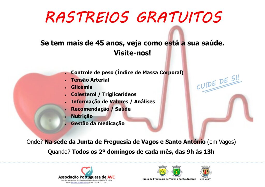 Todos os 2º domingos de cada mês, das 9h às 13h, os profissionais de saúde voluntários da Associação Portuguesa de AVC irão realizar rastreios gratuitos aos fatores de risco cardiovasculares na sede da Junta de Freguesia de Vagos e Santo António.