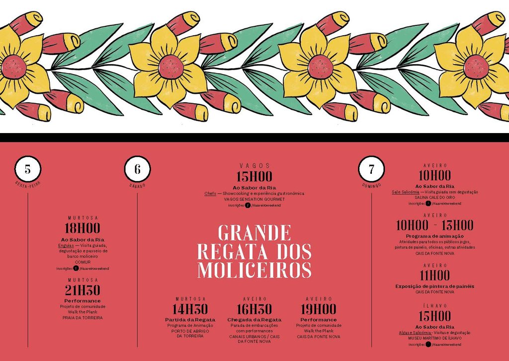 Da agenda do RAW (Ria de Aveiro Weekend), destaca-se a Grande Regata dos Moliceiros da Ria de Aveiro, um evento histórico e emblemático que se realiza no sábado, dia 6, e que terá um programa próprio de animação, nos pontos de partida e de chegada, com atividades musicais e educativas, que convidam o público a viver esta icónica tradição. Com saída da Praia da Torreira, Murtosa, às 14h30, a Grande Regata dos Moliceiros conta com 15 esplendorosas embarcações, que, engalanadas, prometem uma competição única, repleta de cor e muita animação. A chegada a Aveiro e a entrada no Cais da Fonte Nova, está prevista por volta das 16h30, onde decorrerá uma parada de embarcações acompanhada de música ao vivo e outras performances artísticas. Às 19h00, apresenta-se o projeto assinado pela companhia inglesa Walk the Plank, que resulta de um trabalho desenvolvido ao longo dos últimos meses em conjunto com participantes dos 11 municípios da CIRA, numa celebração simbólica e afetiva sem precedentes.